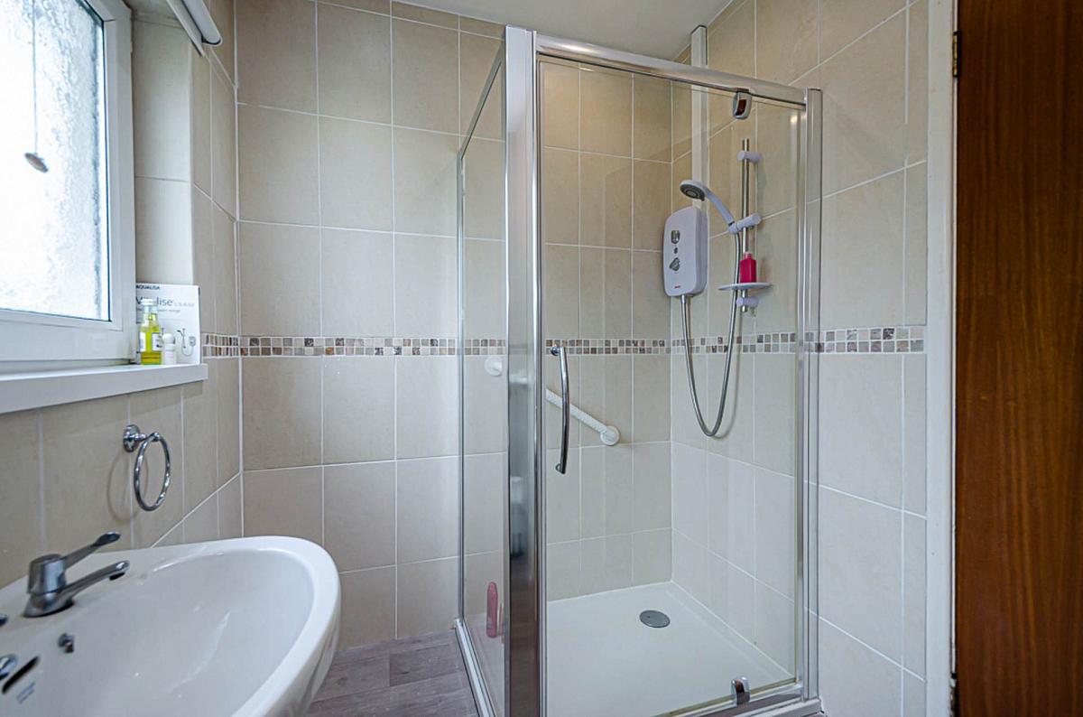 Corner shower cubicle with electric shower, wash hand basin, W.C., modern tiled walls, and recessed spotlights