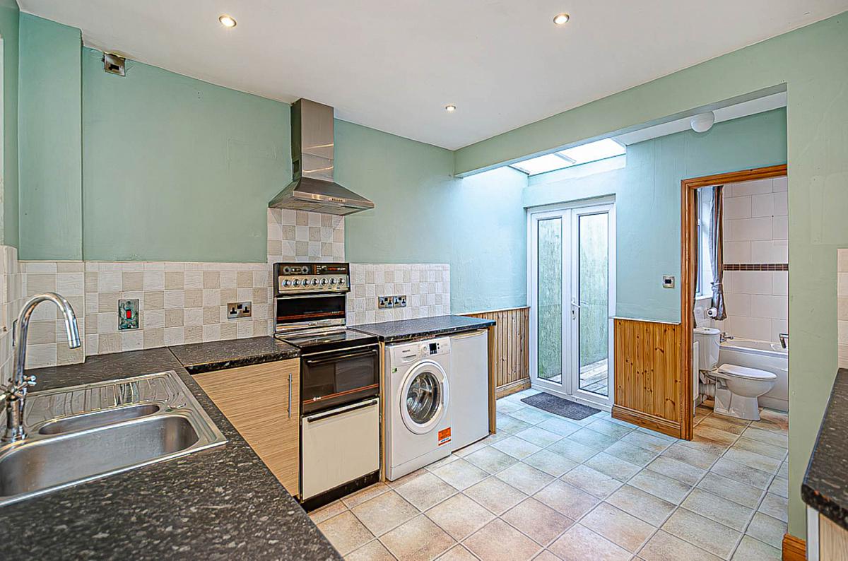 Range of high and low level units, stainless steel bowl a half sink, part tiles walls, recessed spotlights, plumbing for washing machine and double doors to yard