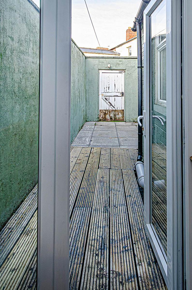 Forecourt and enclosed rear yard in decking and paving