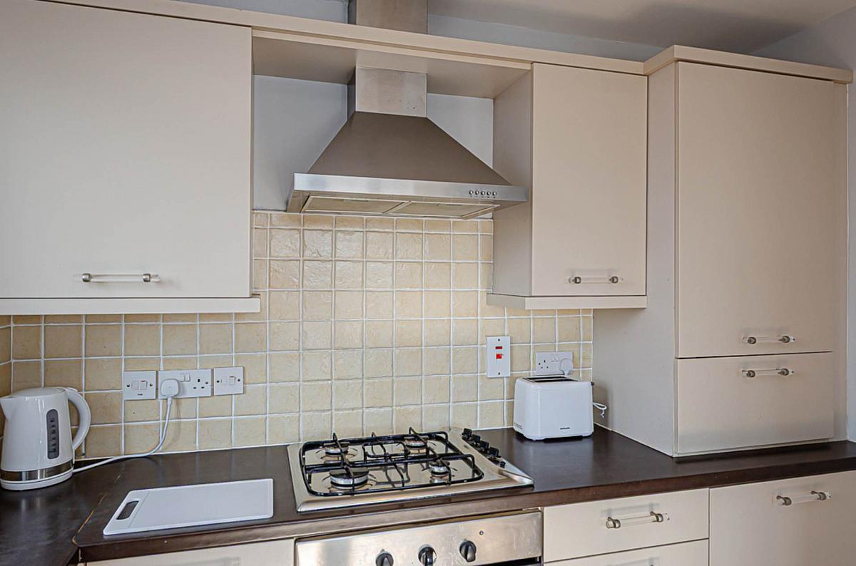 Range of high and low level fitted units, stainless steel oven, gas hob, stainless steel extractor canopy, part tiled walls, gas boiler in cupboard and plumbing for washing machine