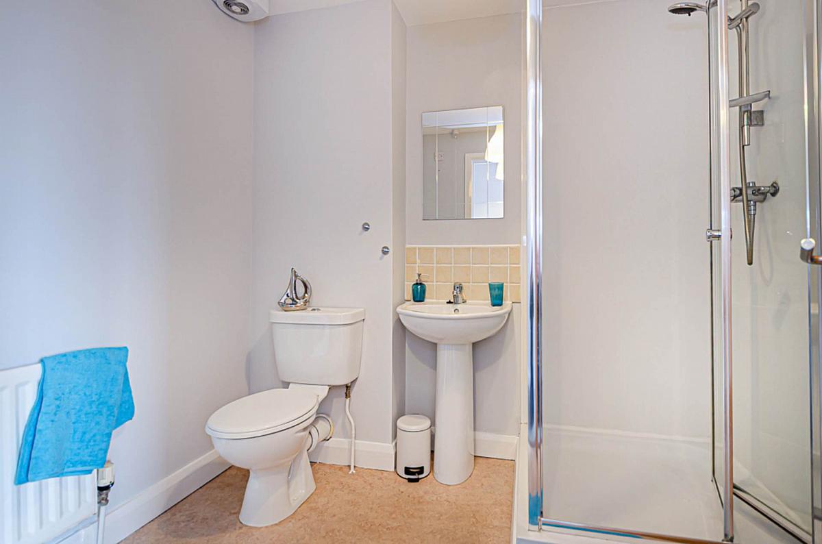 Large shower cubicle with thermostatic shower and sliding door, wash hand basin, W.C., part tiled walls, and extractor fan