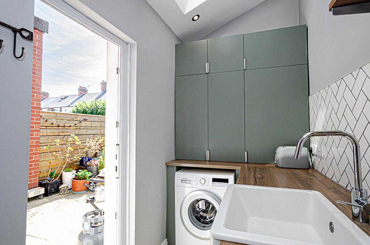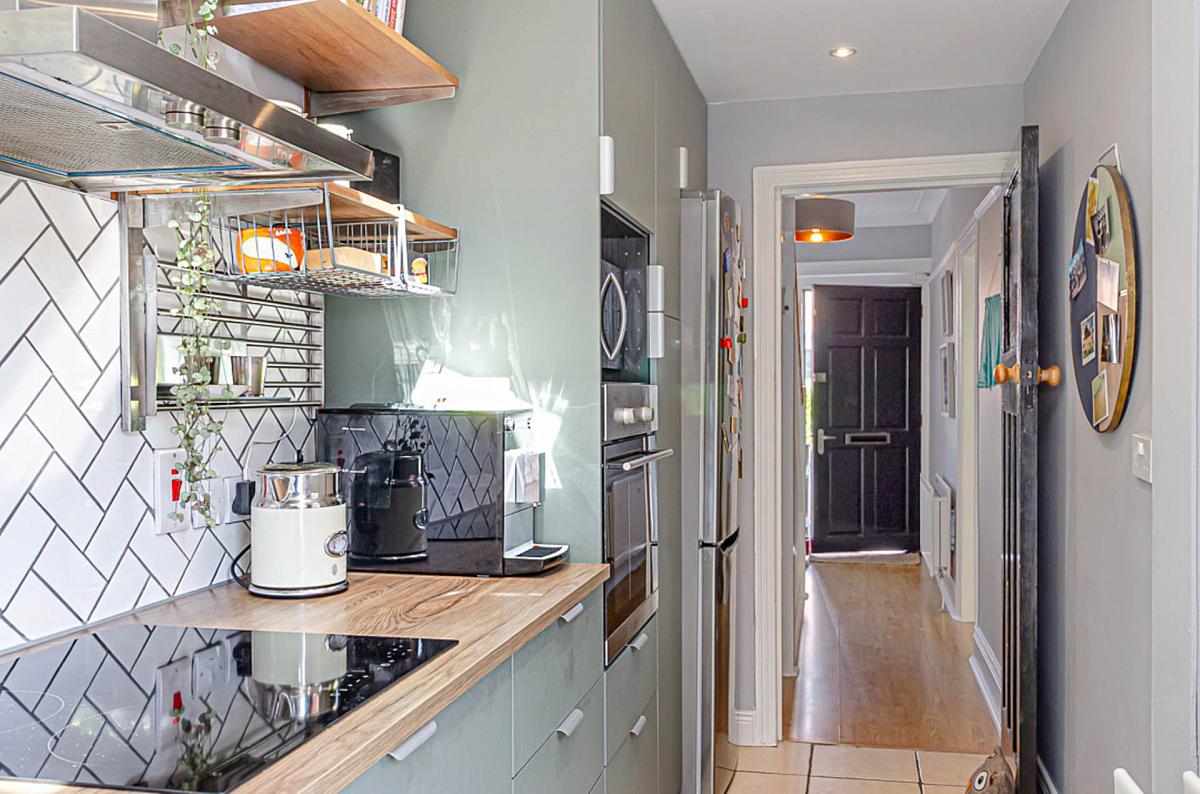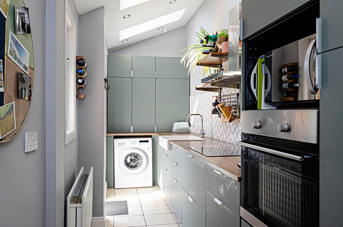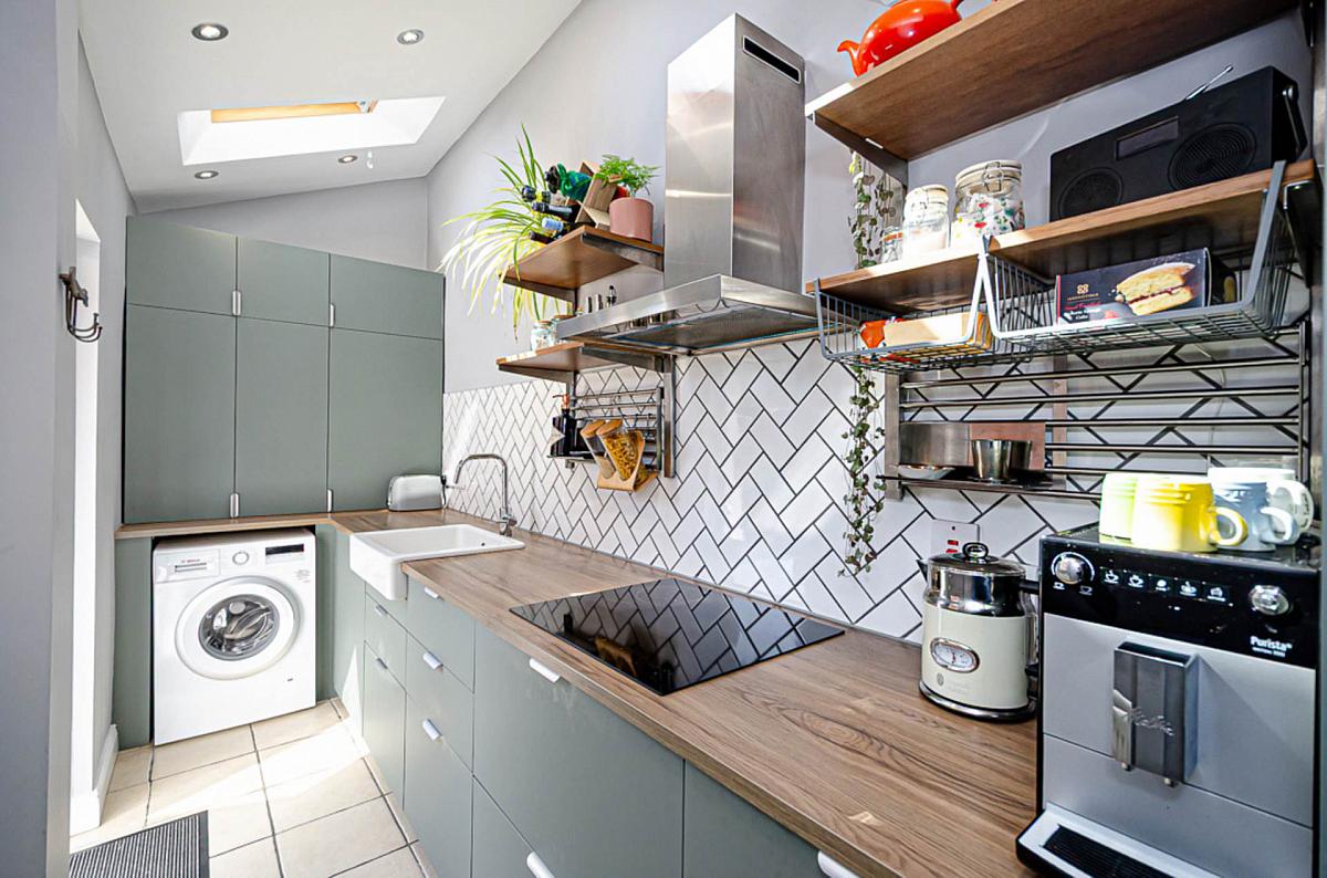 Modern range of matt green units, integrated stainless steel oven, integrated microwave, ceramic hob, stainless steel extractor canopy, Belfast type sink with stainless steel tap, recess for fridge freezer, part tiled walls in herringbone design, ceramic tiled floor, part vaulted ceiling with 2 velux windows, recessed spotlights, and gas boiler in cupboard