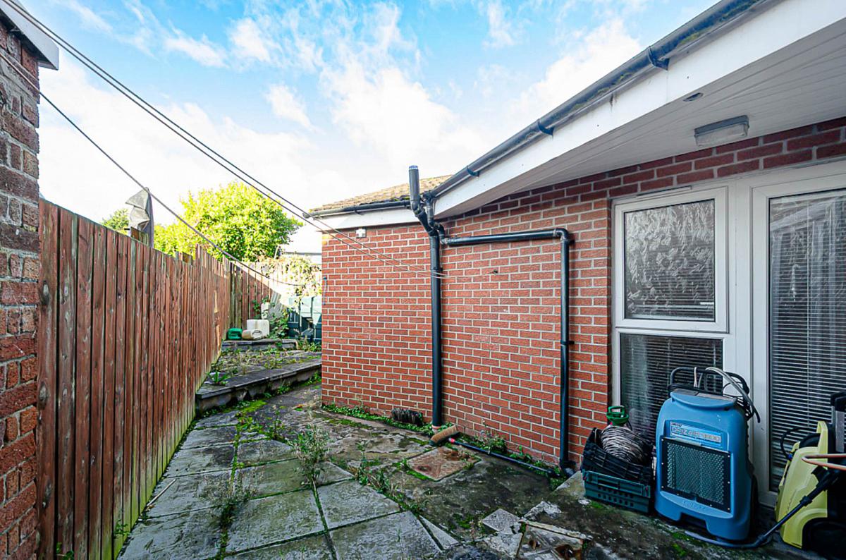 Front garden in paving with disabled ramp to door and rear garden in paving with oil fired boiler and storage tank