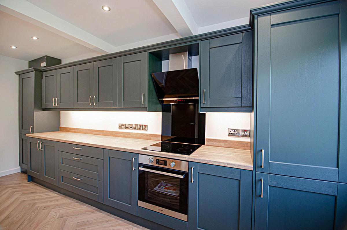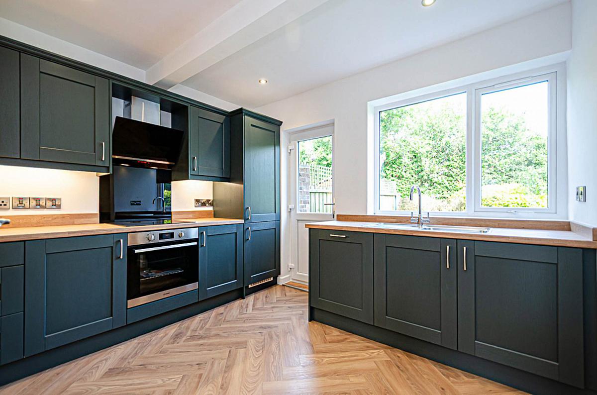 Stunning newly fitted kitchen in opal green finish with stainless steel oven, ceramic hob, black glass splash back, modern angled black and steel extractor canopy, wood effect worktops, integrated fridge freezer, integrated dishwasher, recessed spots, stainless steel vertical radiator, timber laminate floor and gas boiler in cupboard