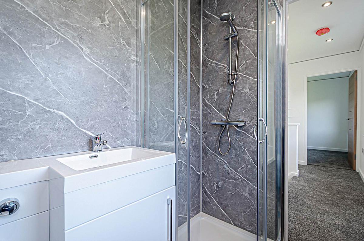Corner shower cubicle with thermostatic shower, wash hand basin and sink in combined unit, marble effect P.V.C. panelled walls, electric chrome towel rail radiator, click laminate floor, recessed spotlights and extractor fan