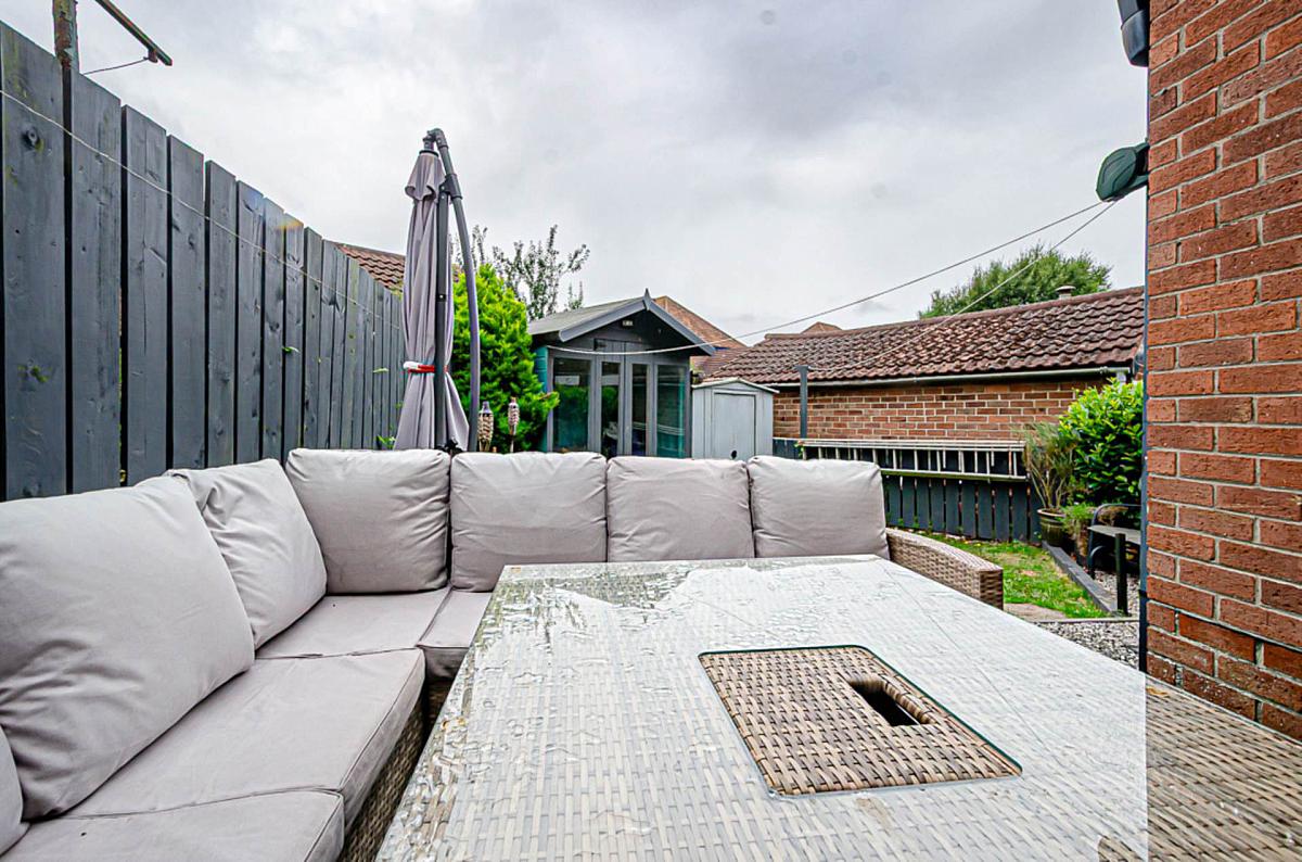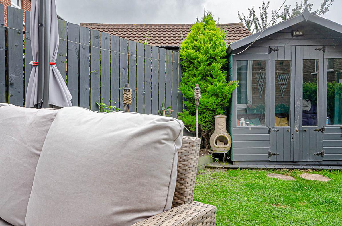 Front and side gardens in lawn with concrete driveway. Rear garden in lawn, small stones and shrub beds with garden shed/ summer room