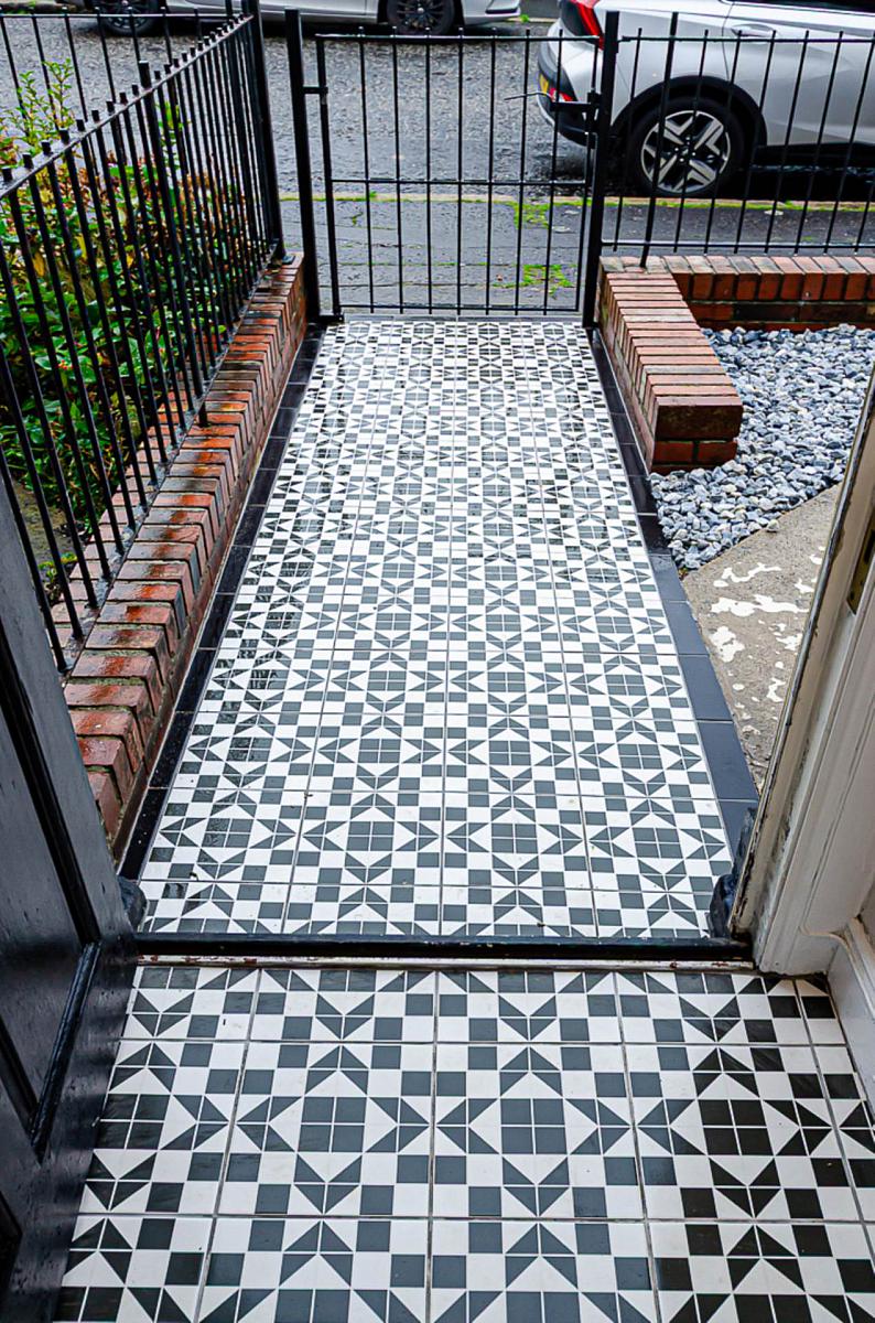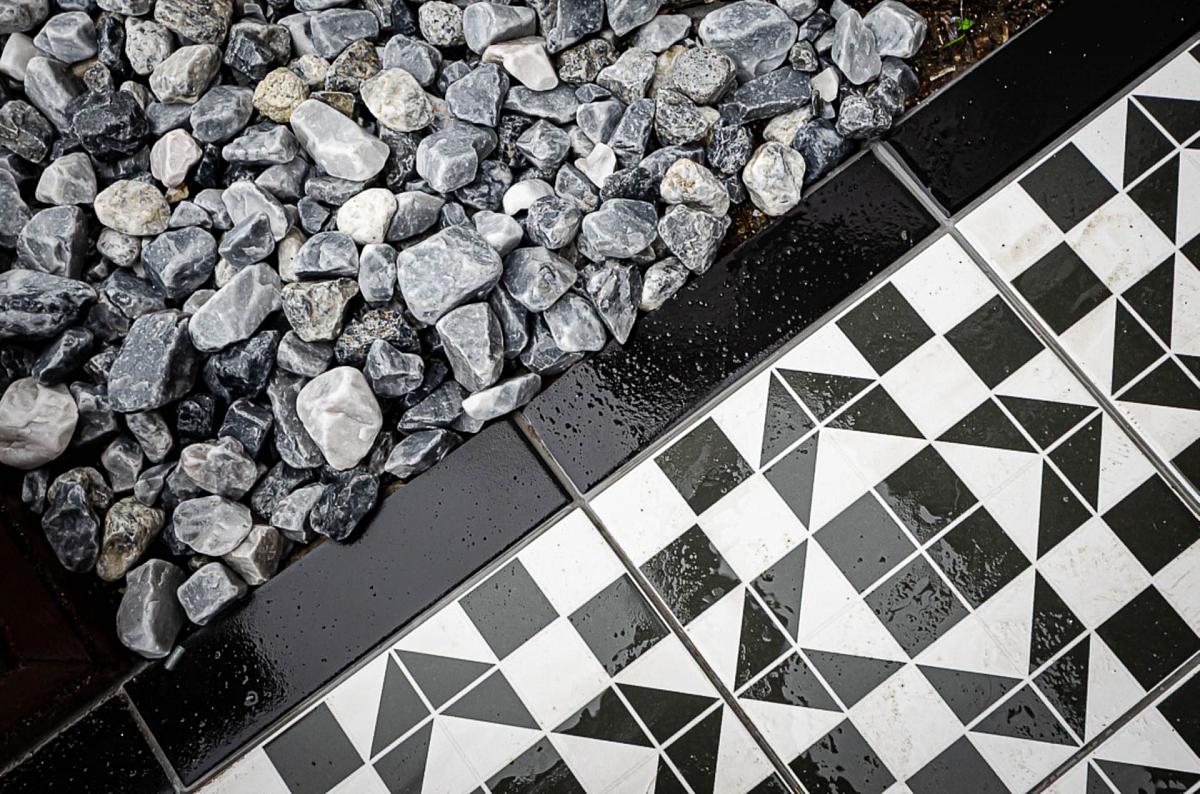 Forecourt in stones and decorative tiled path. Rear yard with access to rear garden in small stones, path and lawn