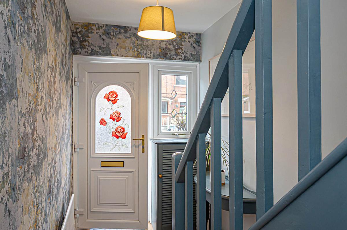 Entrance hall with timber laminate floor and decorative wallpaper