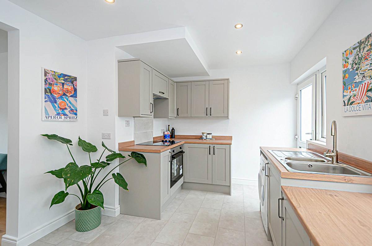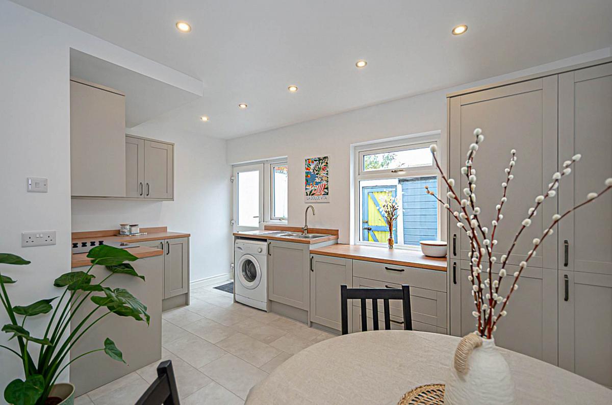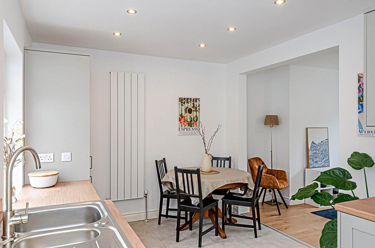 Newly fitted kitchen with integrated appliances and dining space