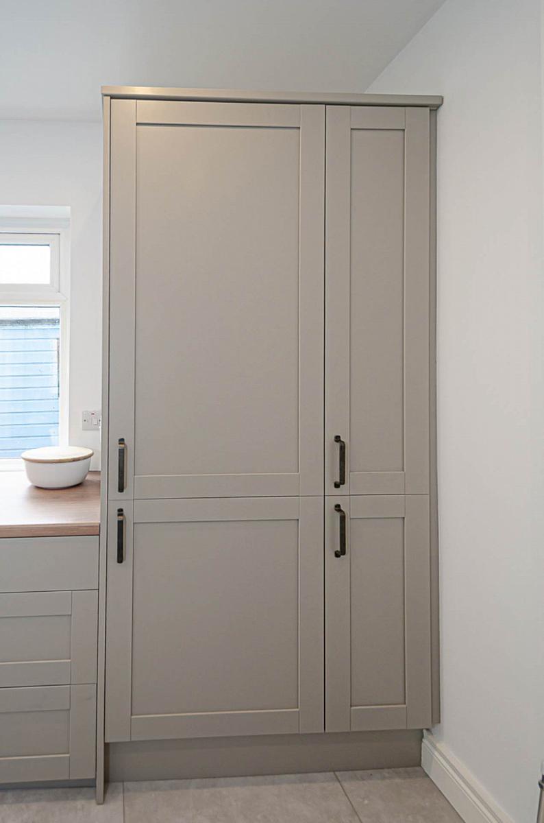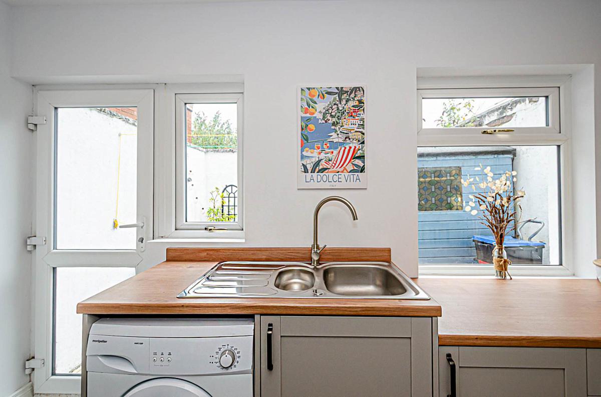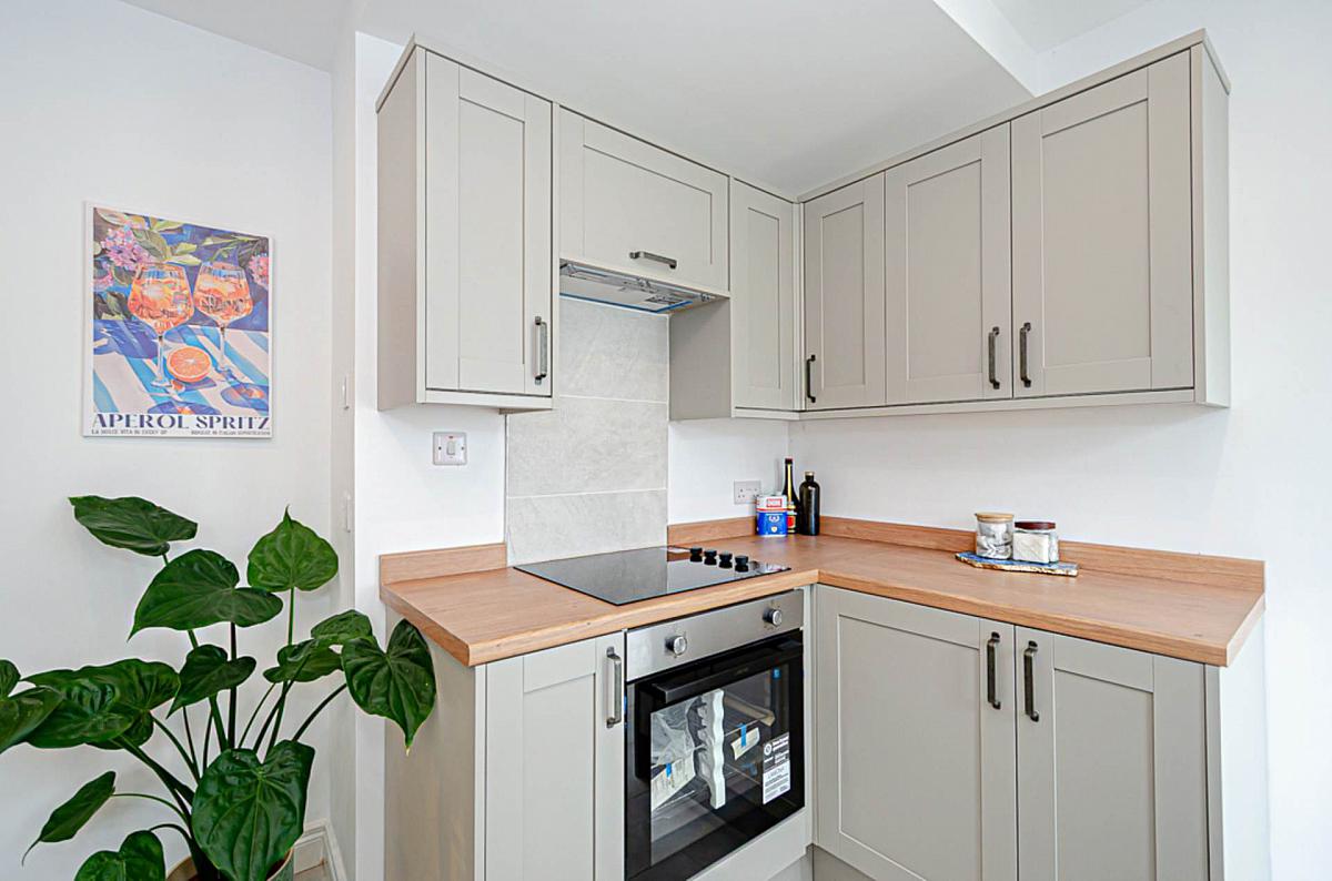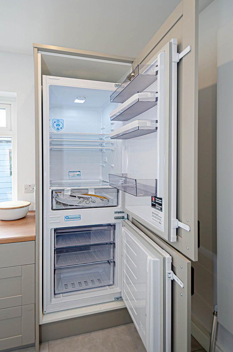 Newly fitted kitchen with integrated appliances and dining space