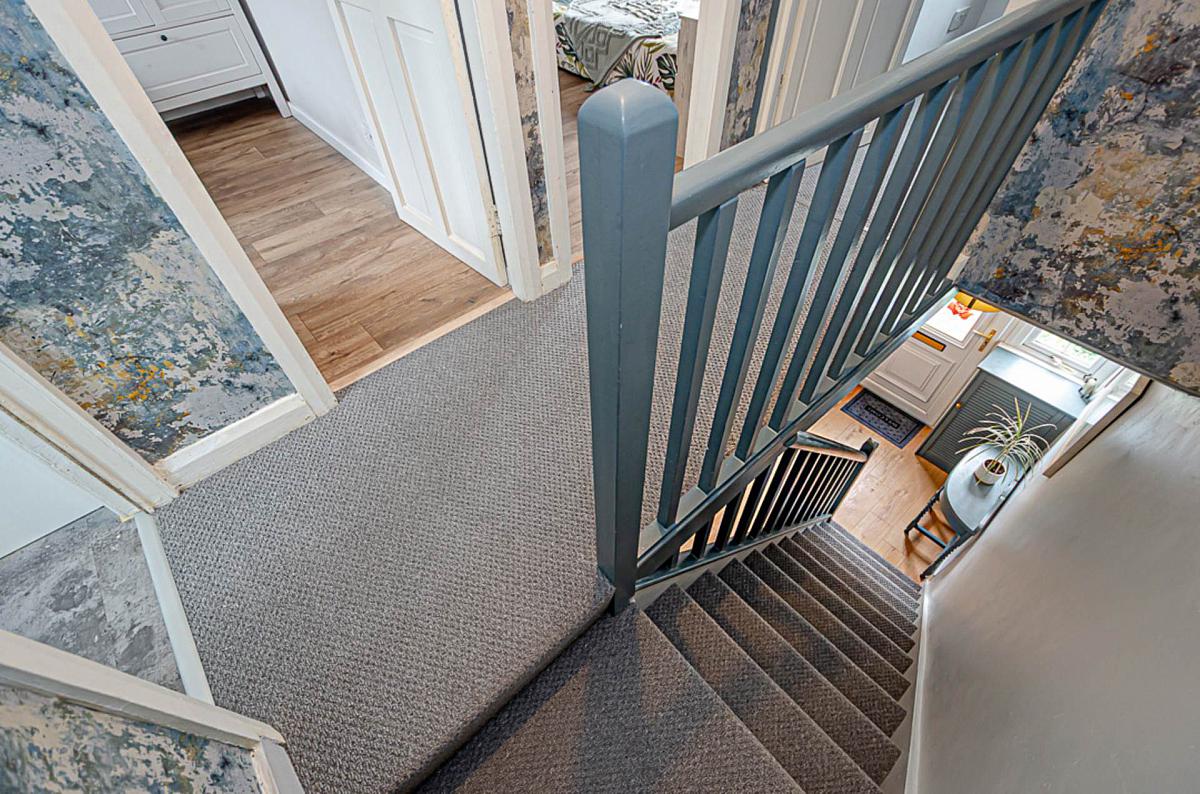 Cloak space under stairs, timber laminate floor and decorative wallpaper