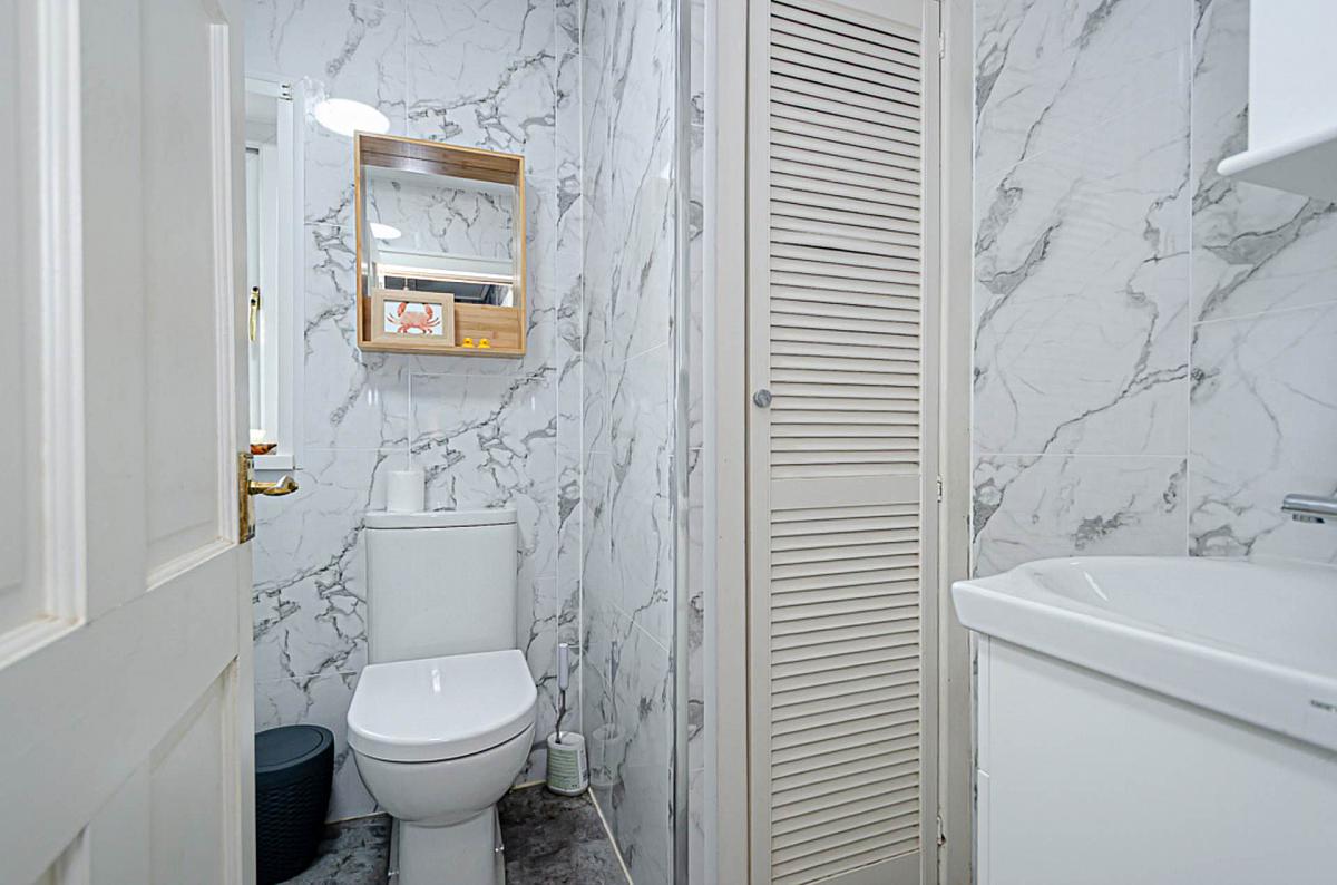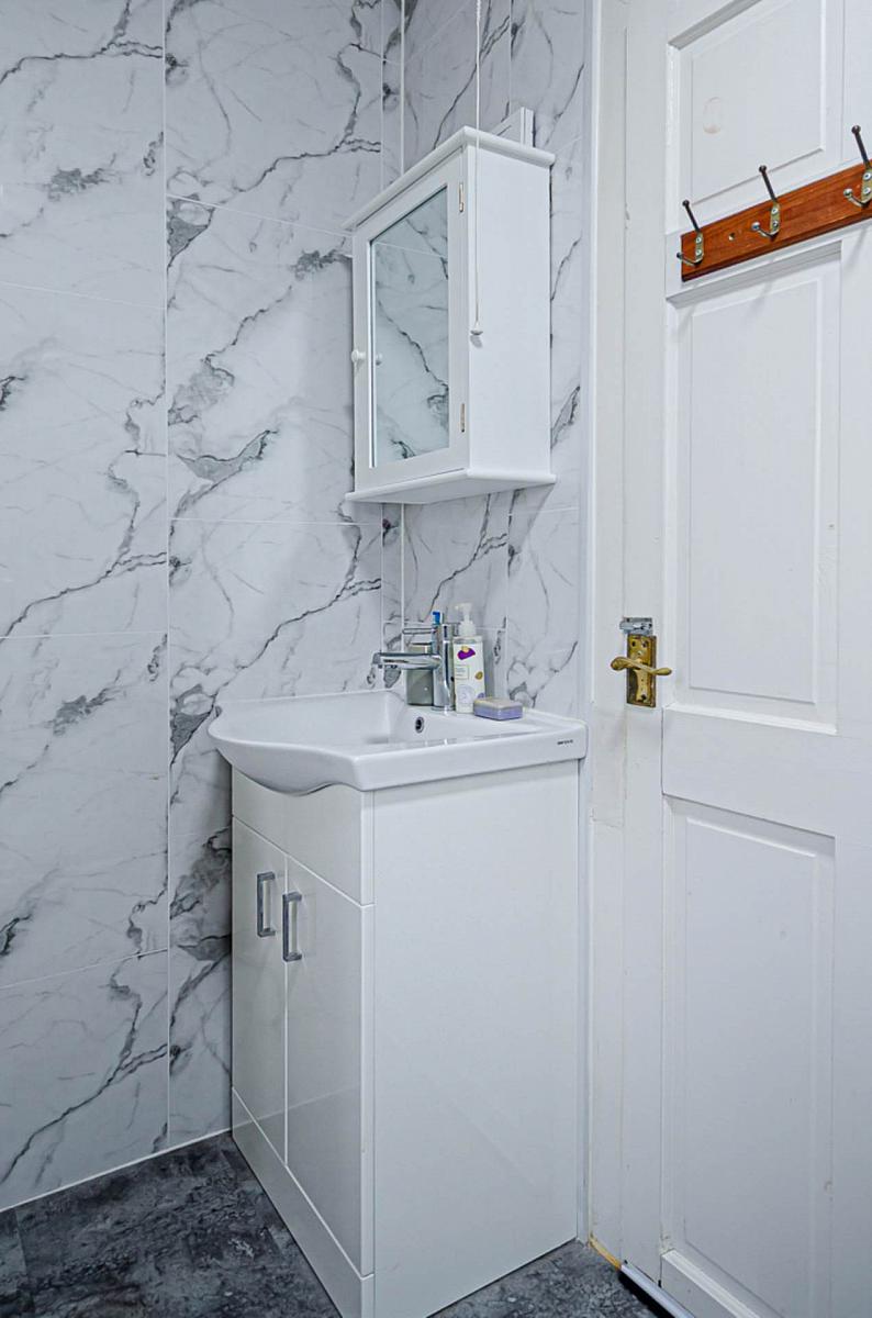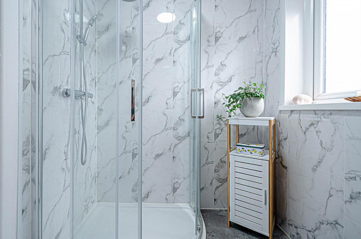 Corner shower cubicle with thermostatic shower and sliding doors, wash hand basin in vanity unit, W.C., P.V.C. panelled walls in marble effct, P.V.C. panelled ceiling and gas boiler in cupboard