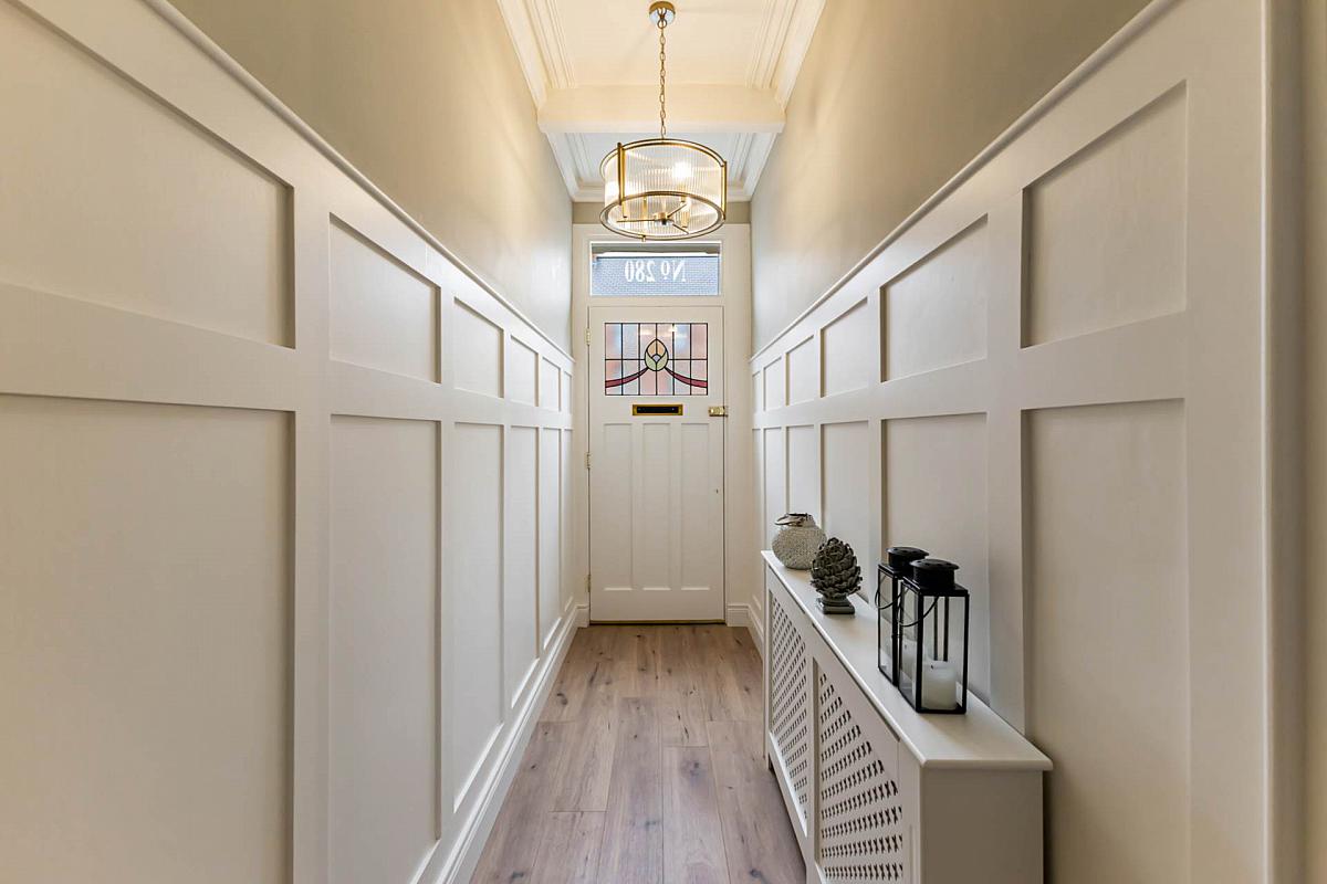 Welcome to this beautifully renovated three-storey terrace, where period charm meets modern sophistication. From the moment you arrive, the classic checkerboard pathway and deep navy front door set the tone for the elegance within. Step inside and you're greeted by a thoughtfully designed entrance hall, where timber laminate flooring, panelled walls, and decorative corbels create a striking first impression.