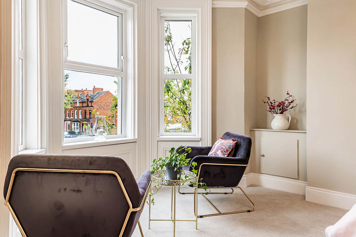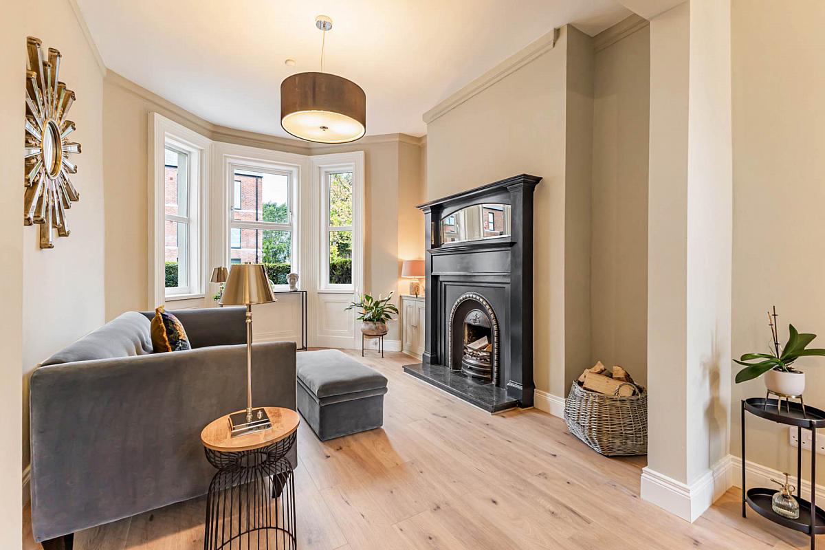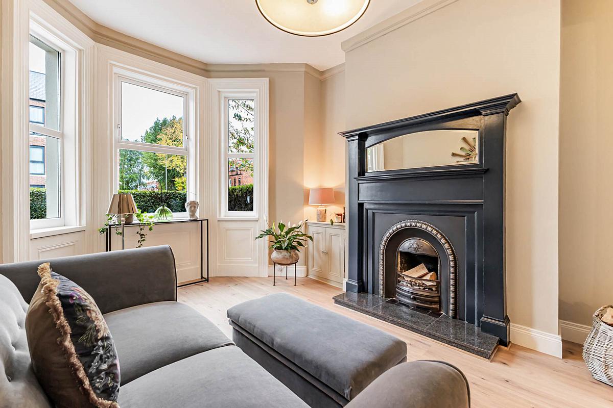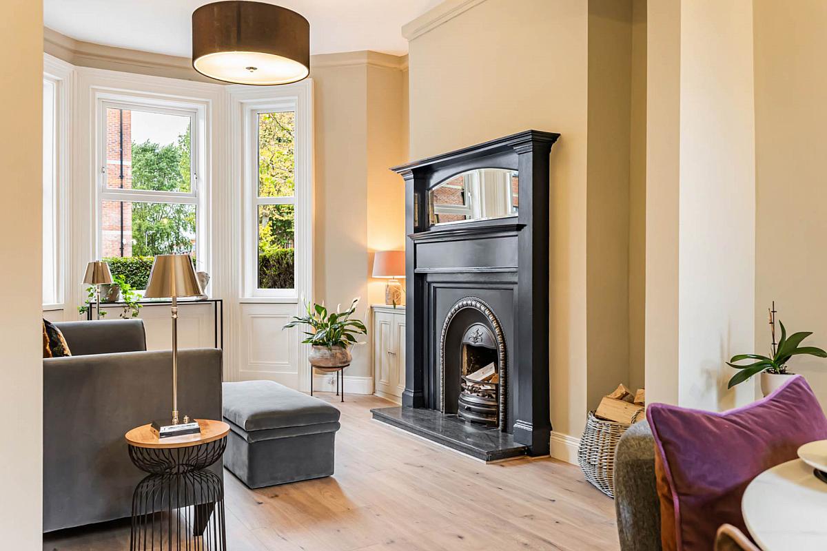 Through lounge with bay window and feature fireplace