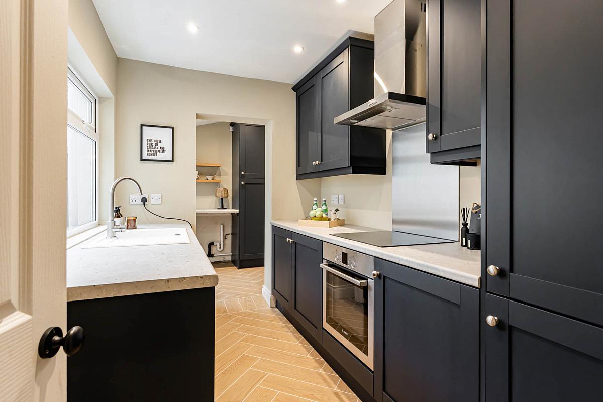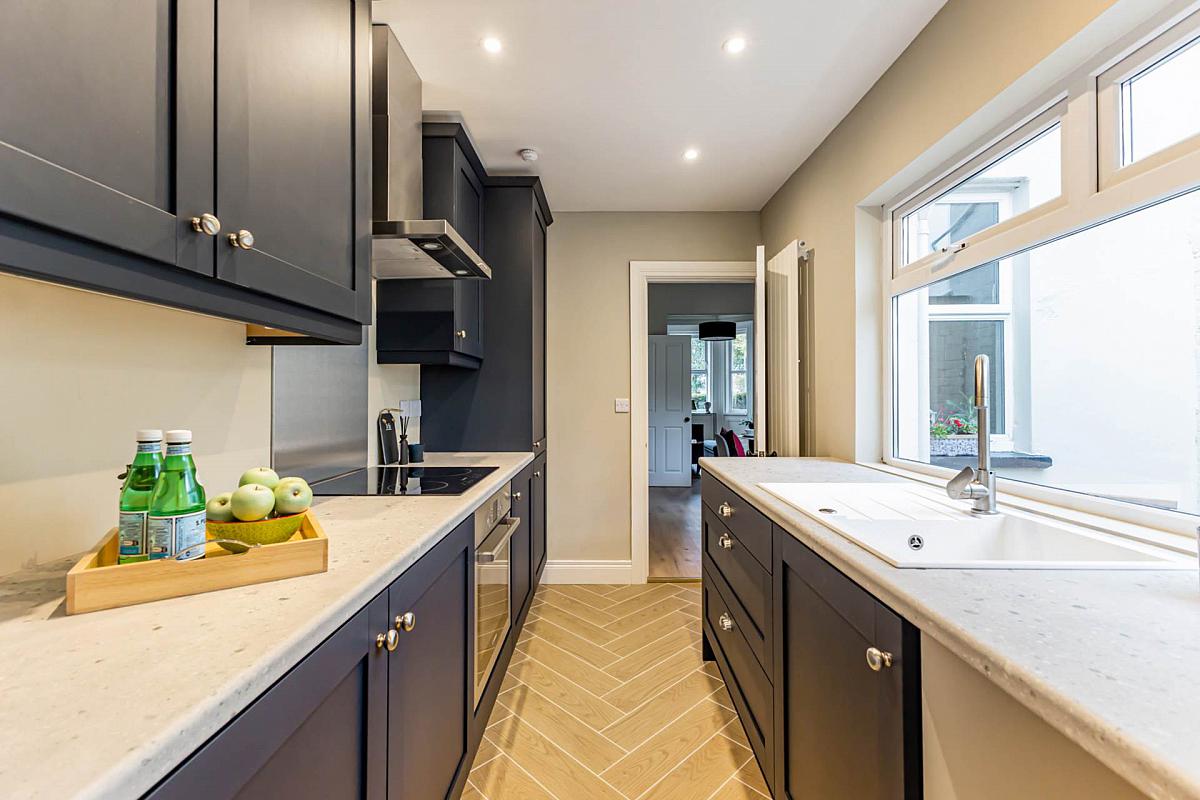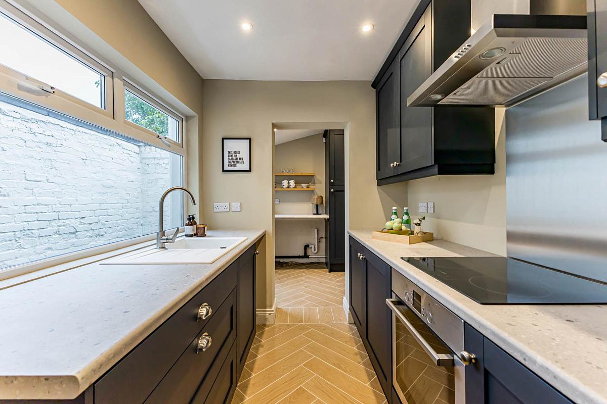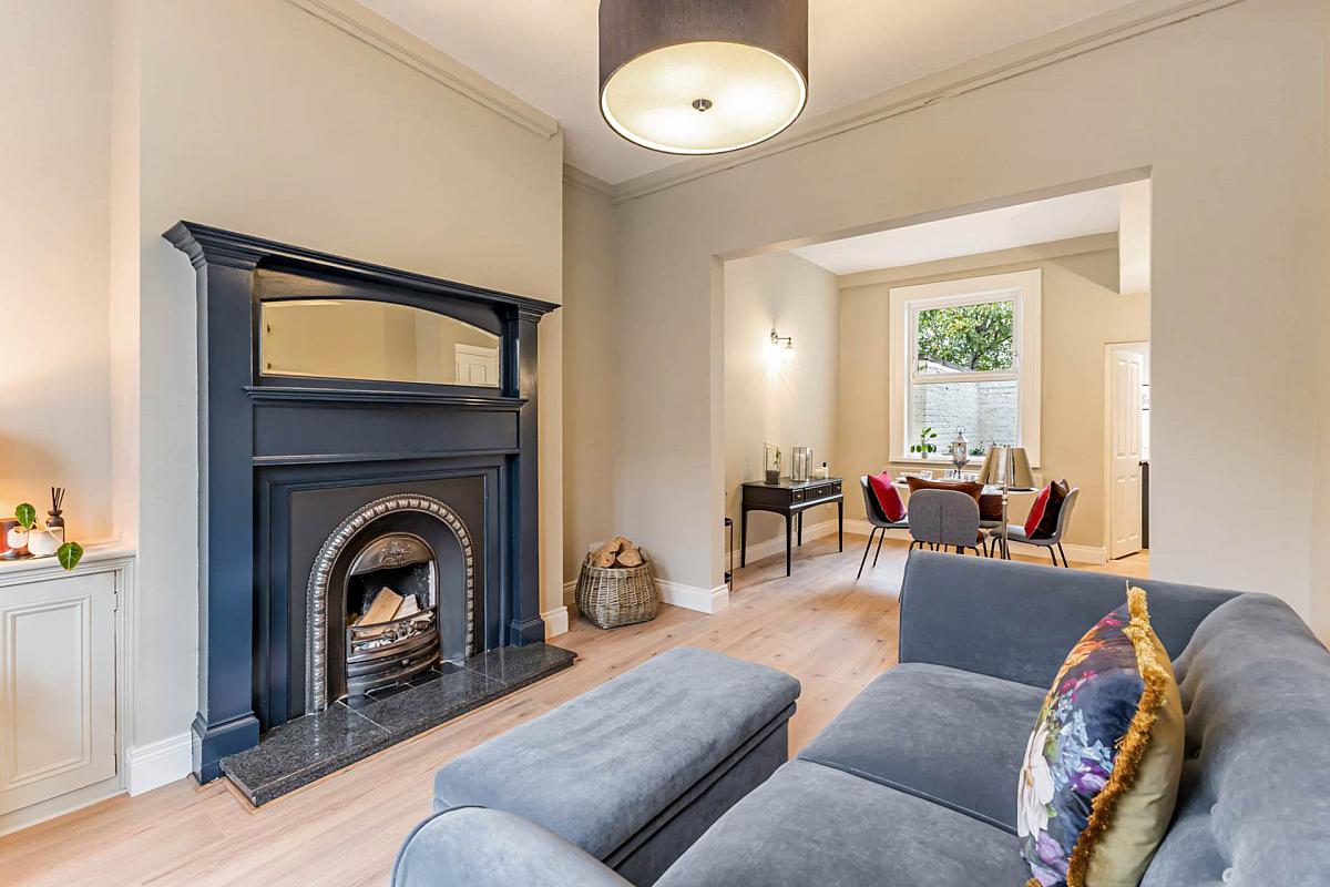 At the heart of the home lies a stunning navy kitchen, finished to perfection with bespoke 5-piece doors, new fittings, and a timber-effect ceramic tiled floor that flows seamlessly into the utility room. With space for integrated appliances and matching cabinetry, this space combines luxury with practicality. The adjoining through lounge radiates character and warmth, centred around a refined fireplace, while natural light floods in through the charming bay window.