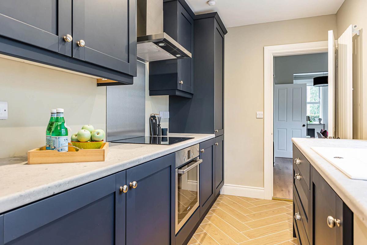 Newly fitted navy kitchen with space for integrated appliances