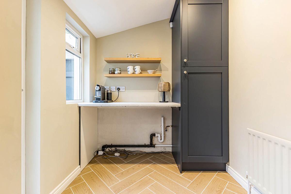 Navy units with newly fitted Navien gas boiler, plumbing for washing machine, space for tumble dryer, shelving, timber effect ceramic tiled floor, and recessed spotlights