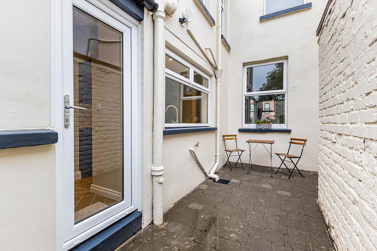 Forecourt in small stones with black and white tiled path. Enclosed read yard in brick paving with flower bed and space for sitting out