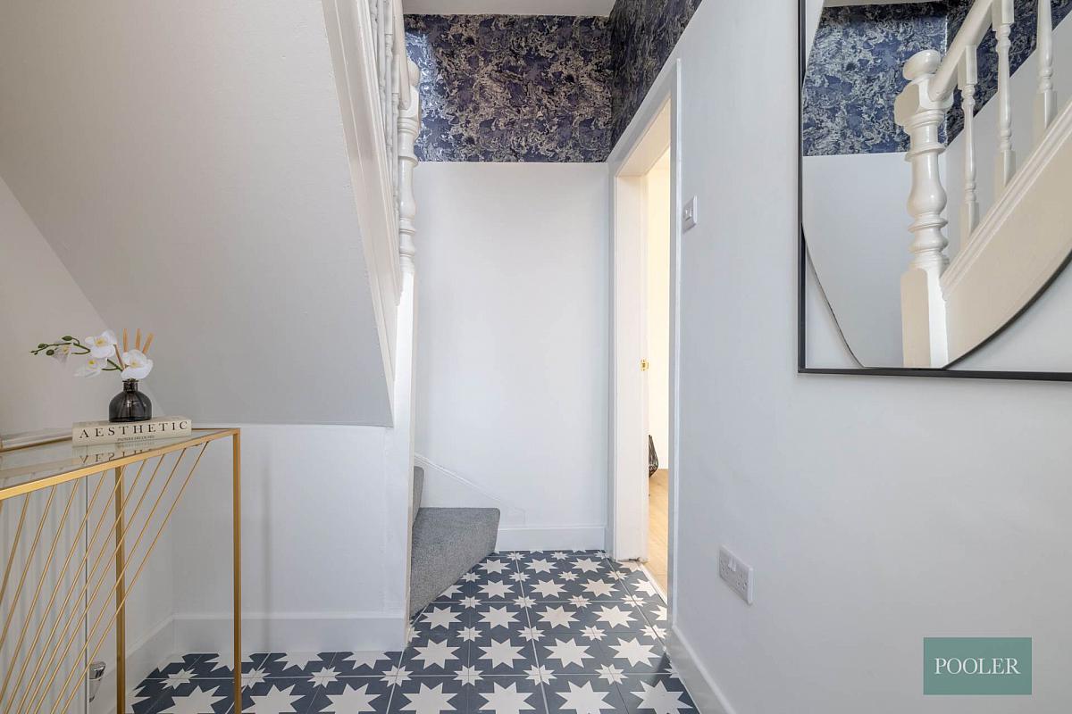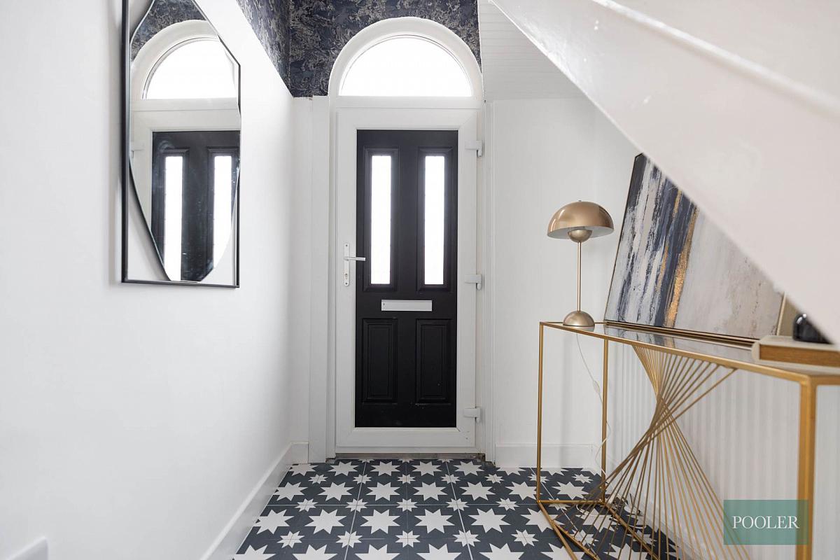 New UPVC front door, cloak space under stairs and decorative tiled floor