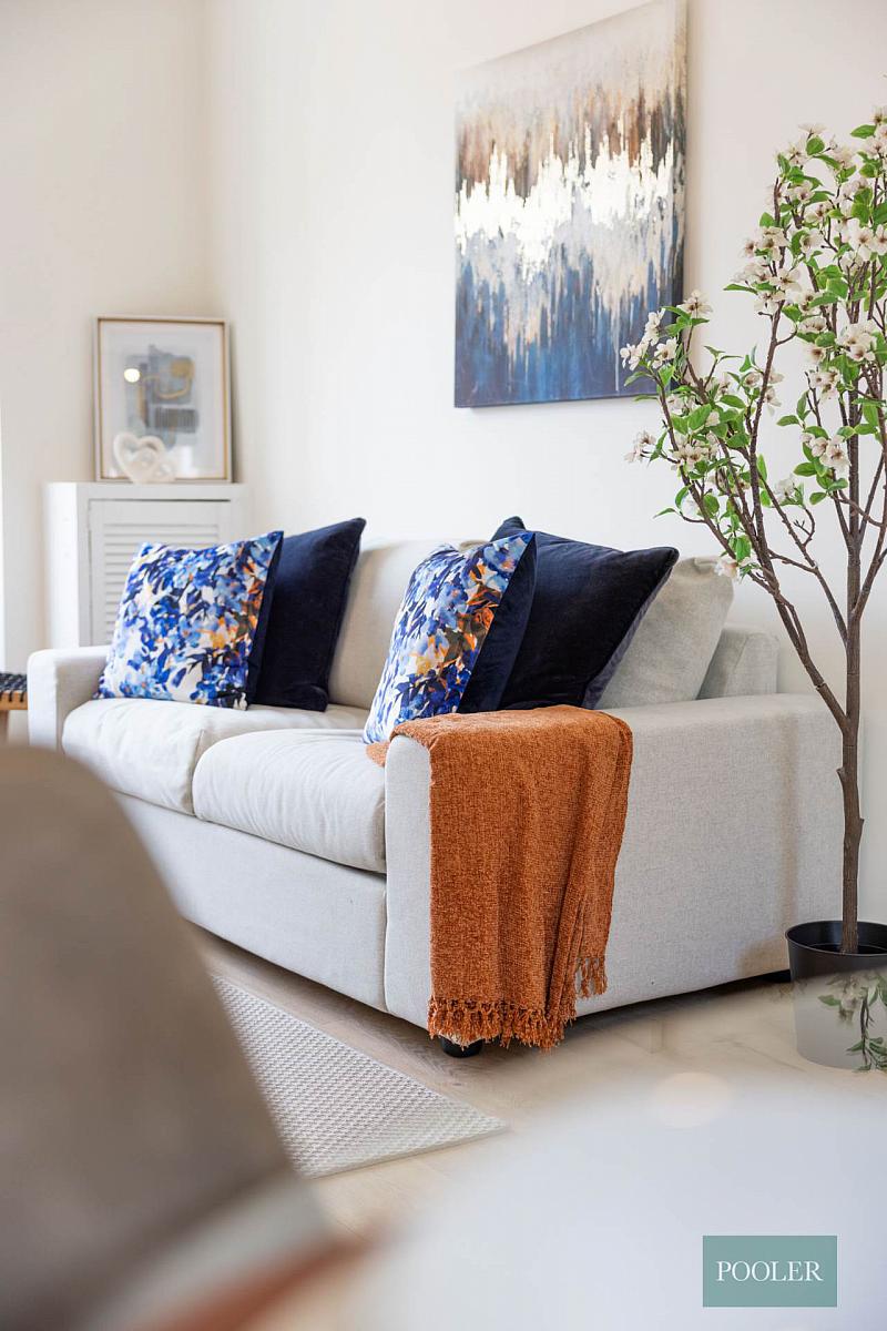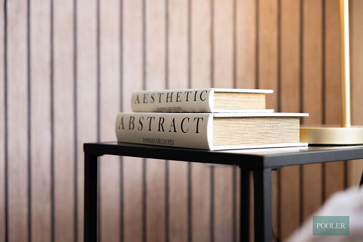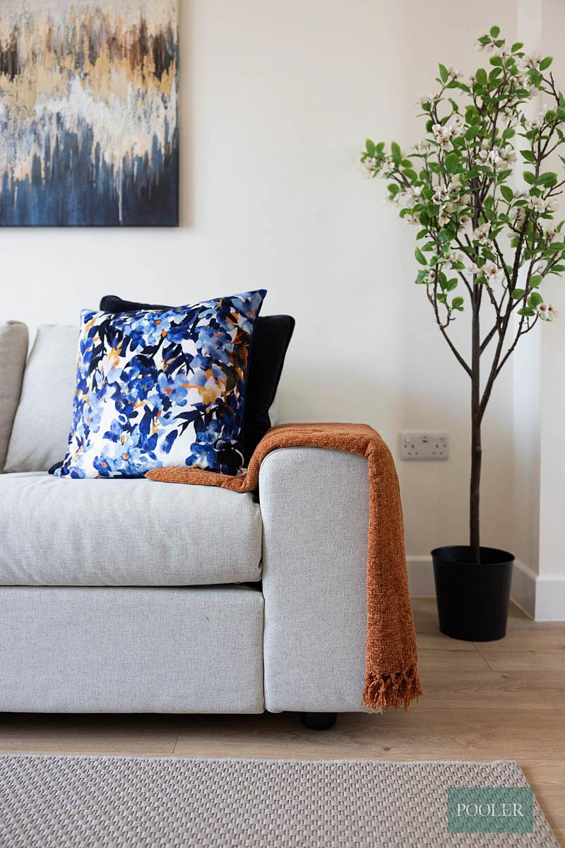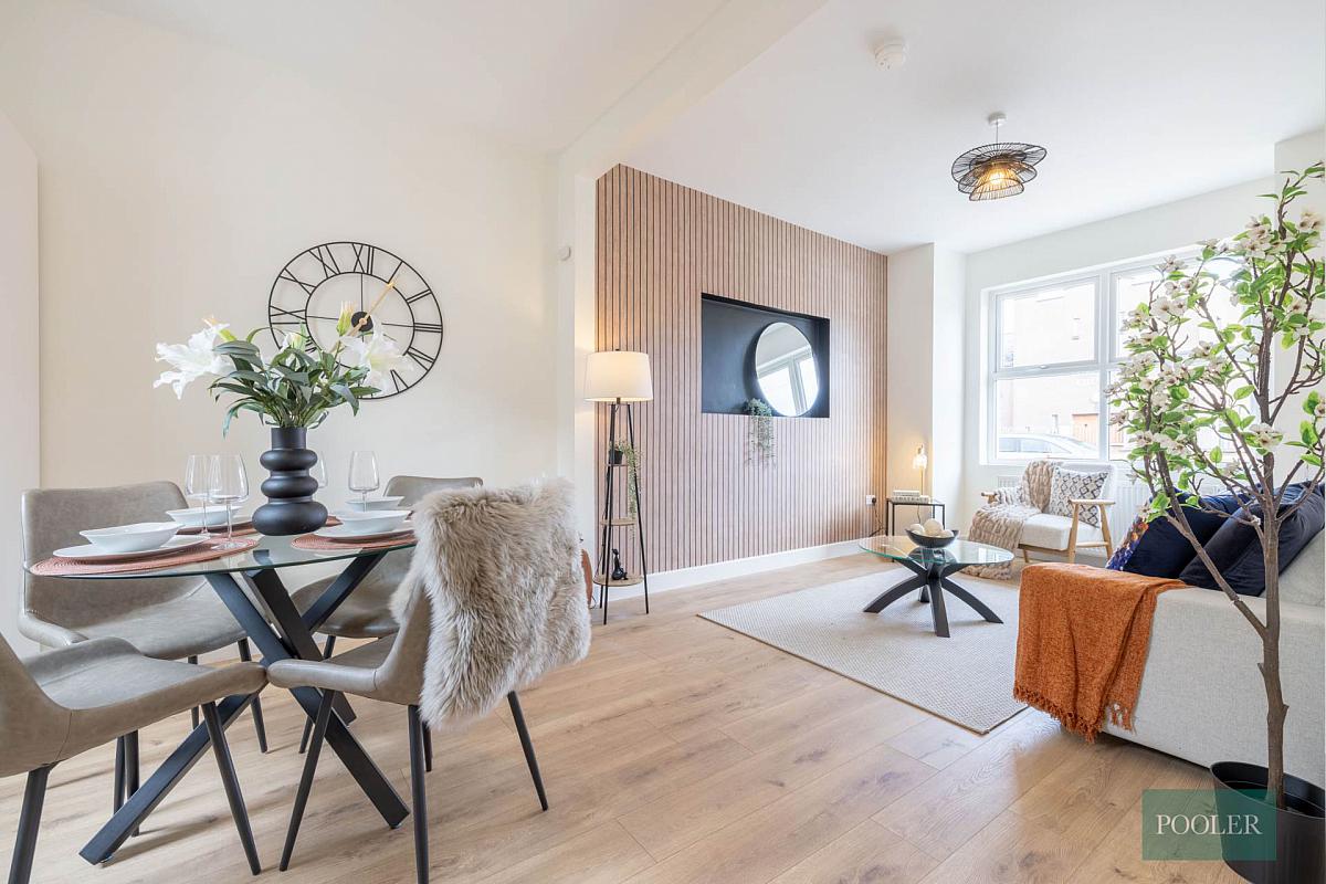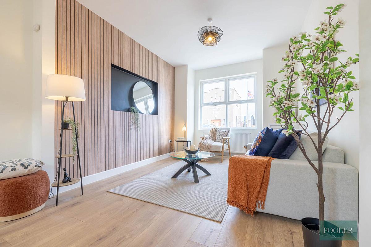 Bay window, media wall in timber panelling effect wallpaper, timber laminate floor and gas boiler in cupboard