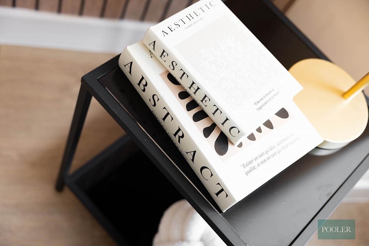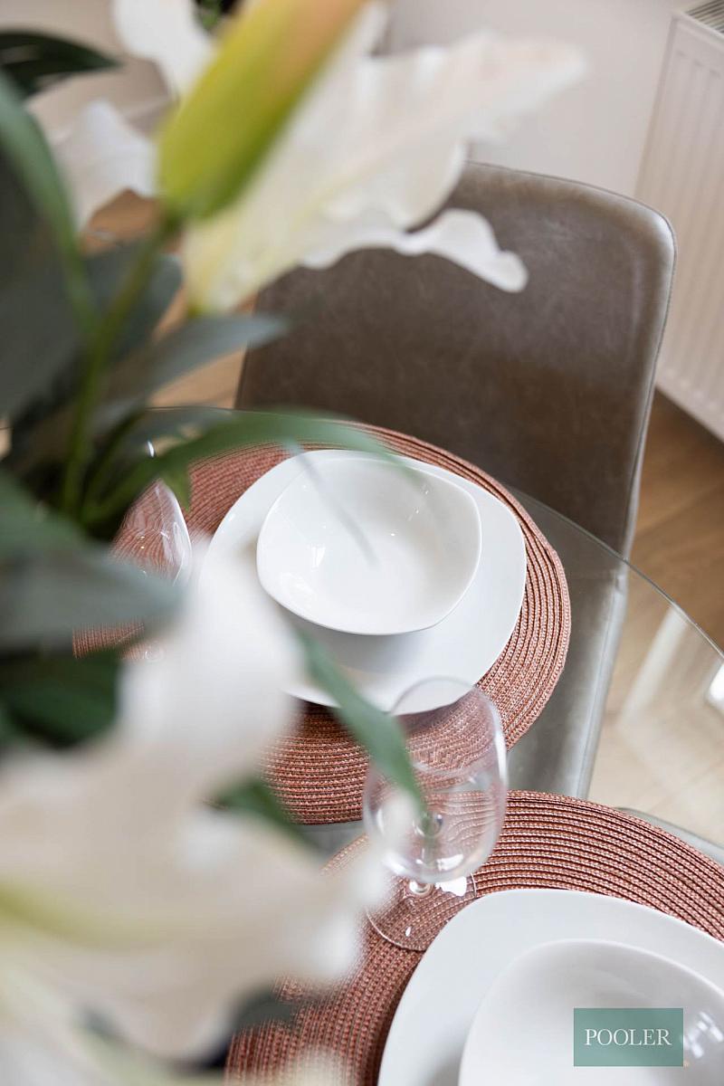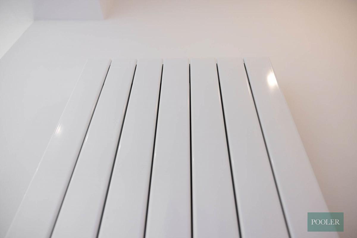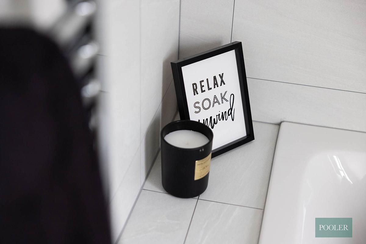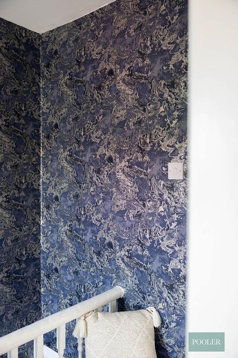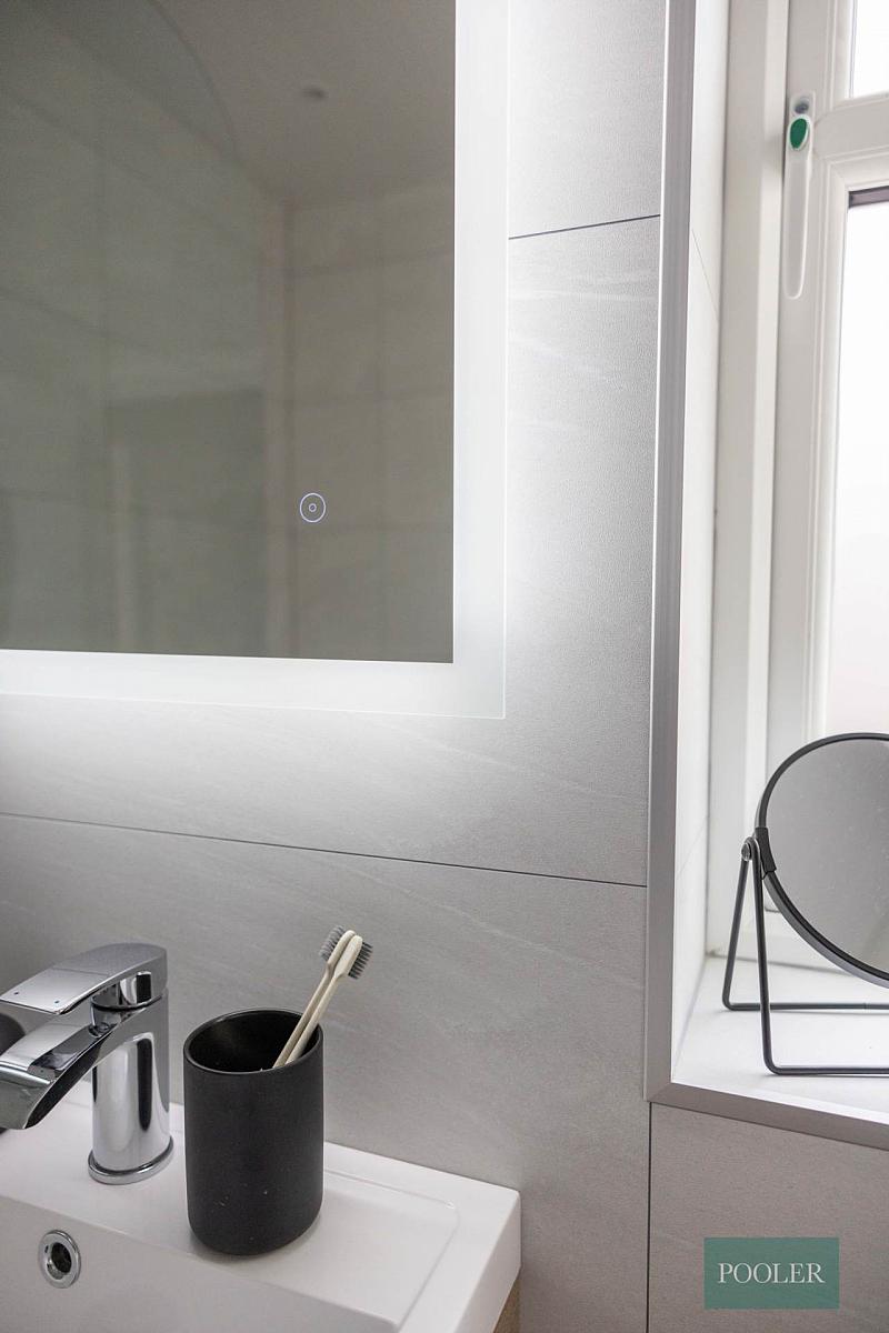 Bay window, media wall in timber panelling effect wallpaper, timber laminate floor and gas boiler in cupboard