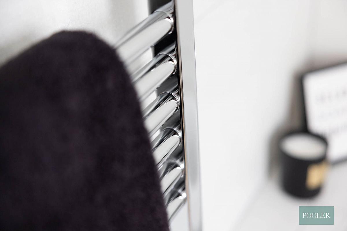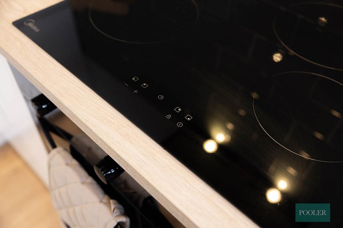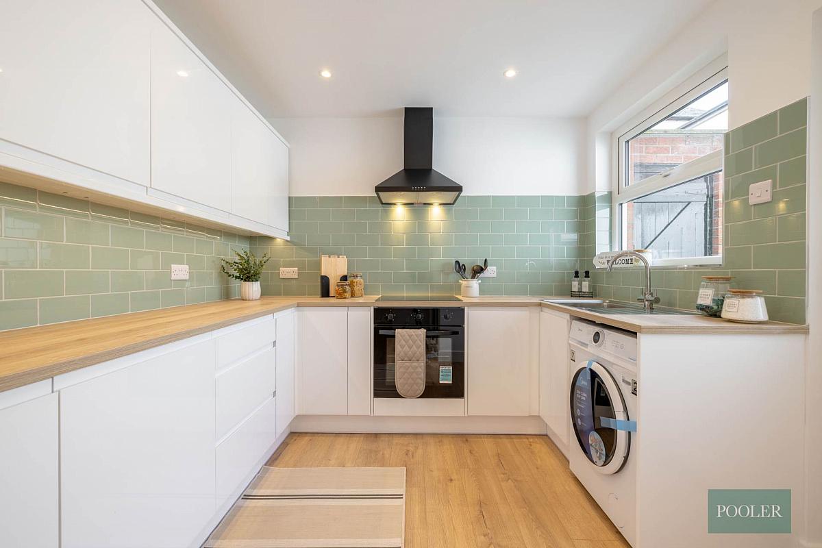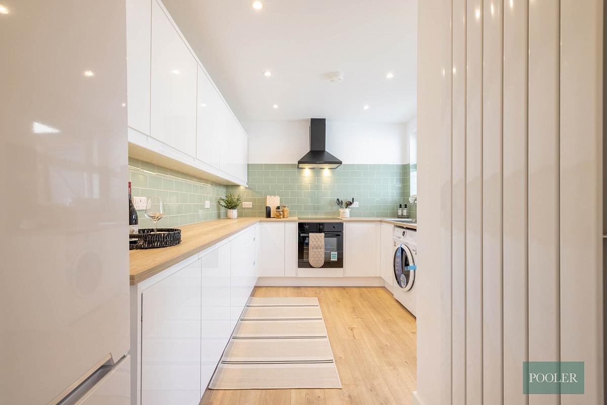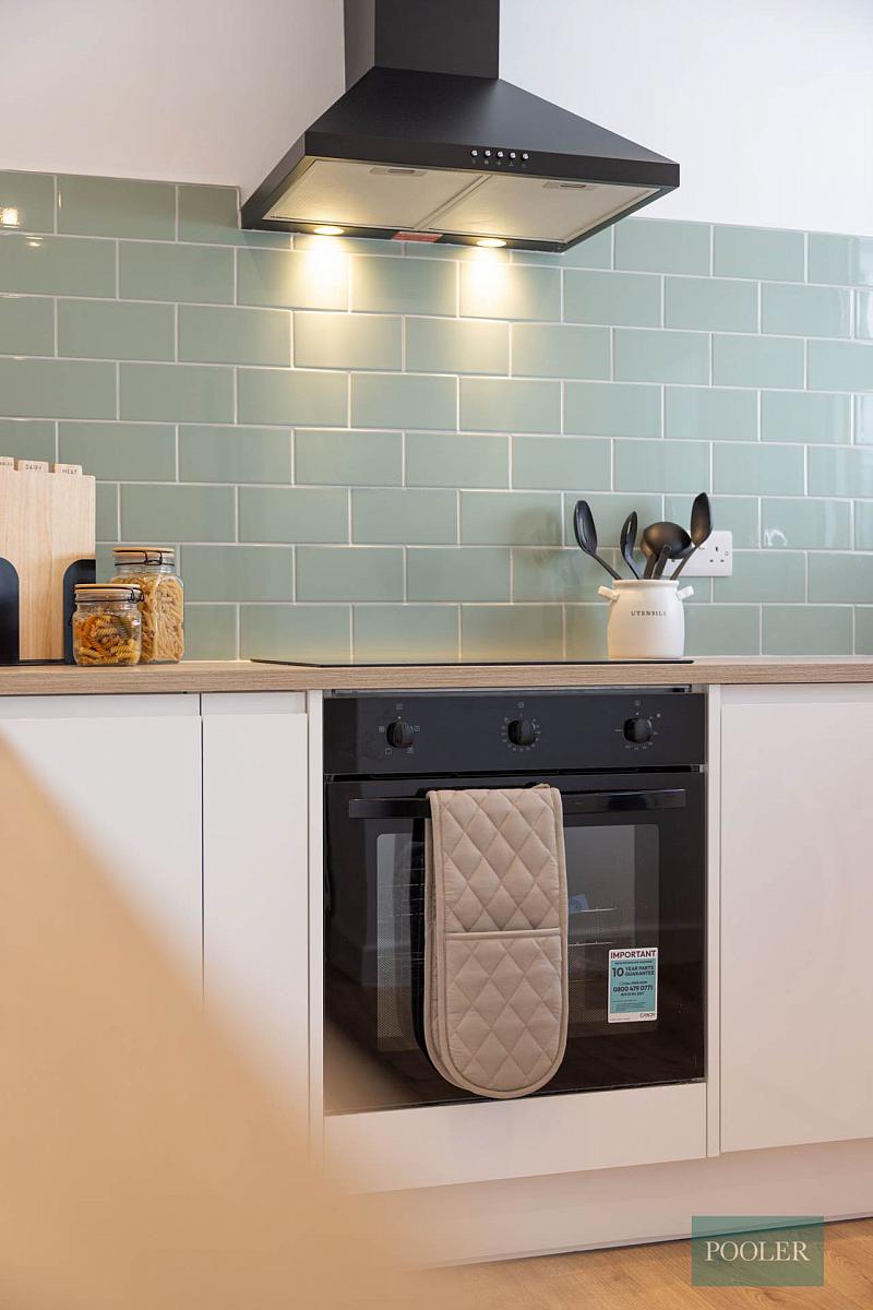 Range of high and low level fitted units, integrated black oven, ceramic hob, black extractor fan, stainless steel sink, part tiled walls in green gloss finish, timber laminate floor, vertical radiator, and storage cupboard