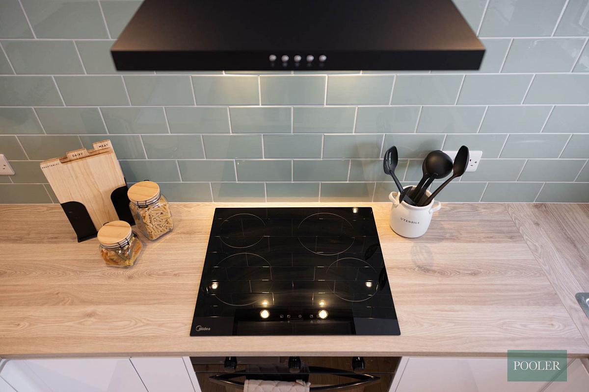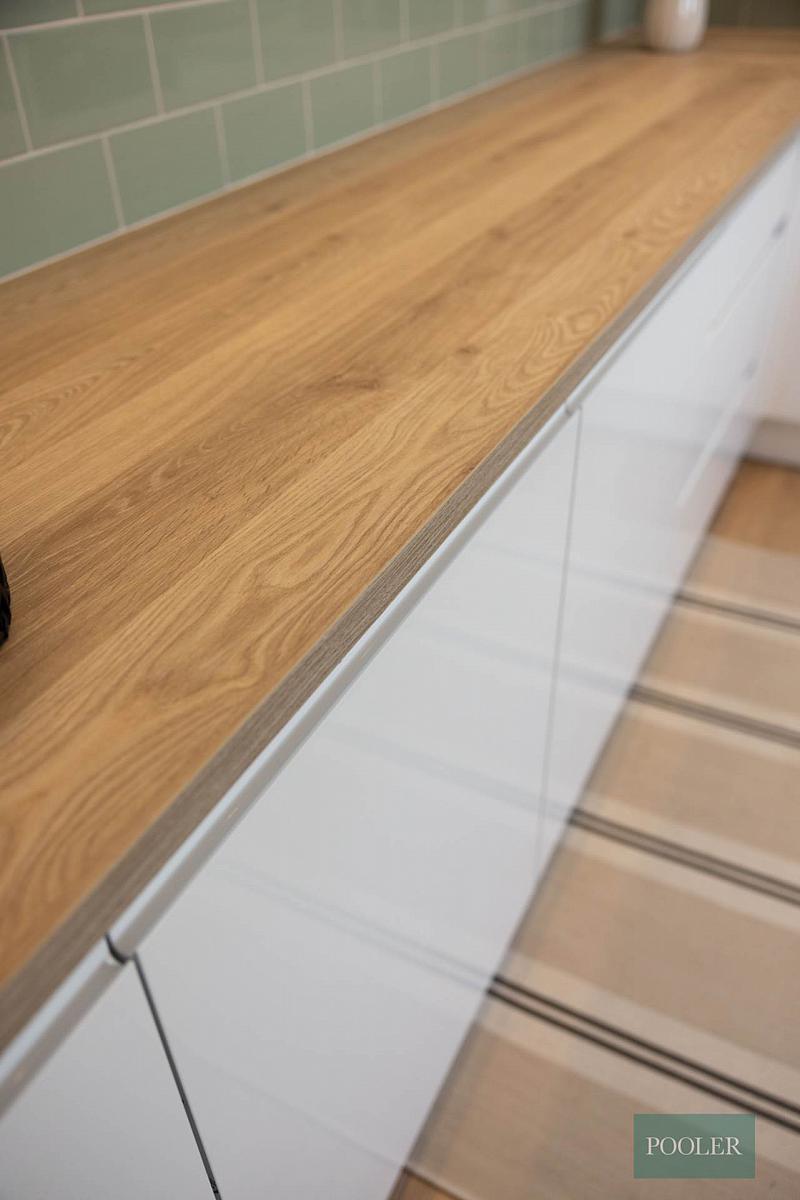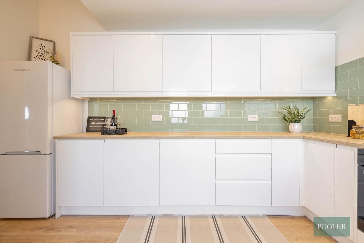 Newly fitted kitchen in white gloss finish with sage green tiling