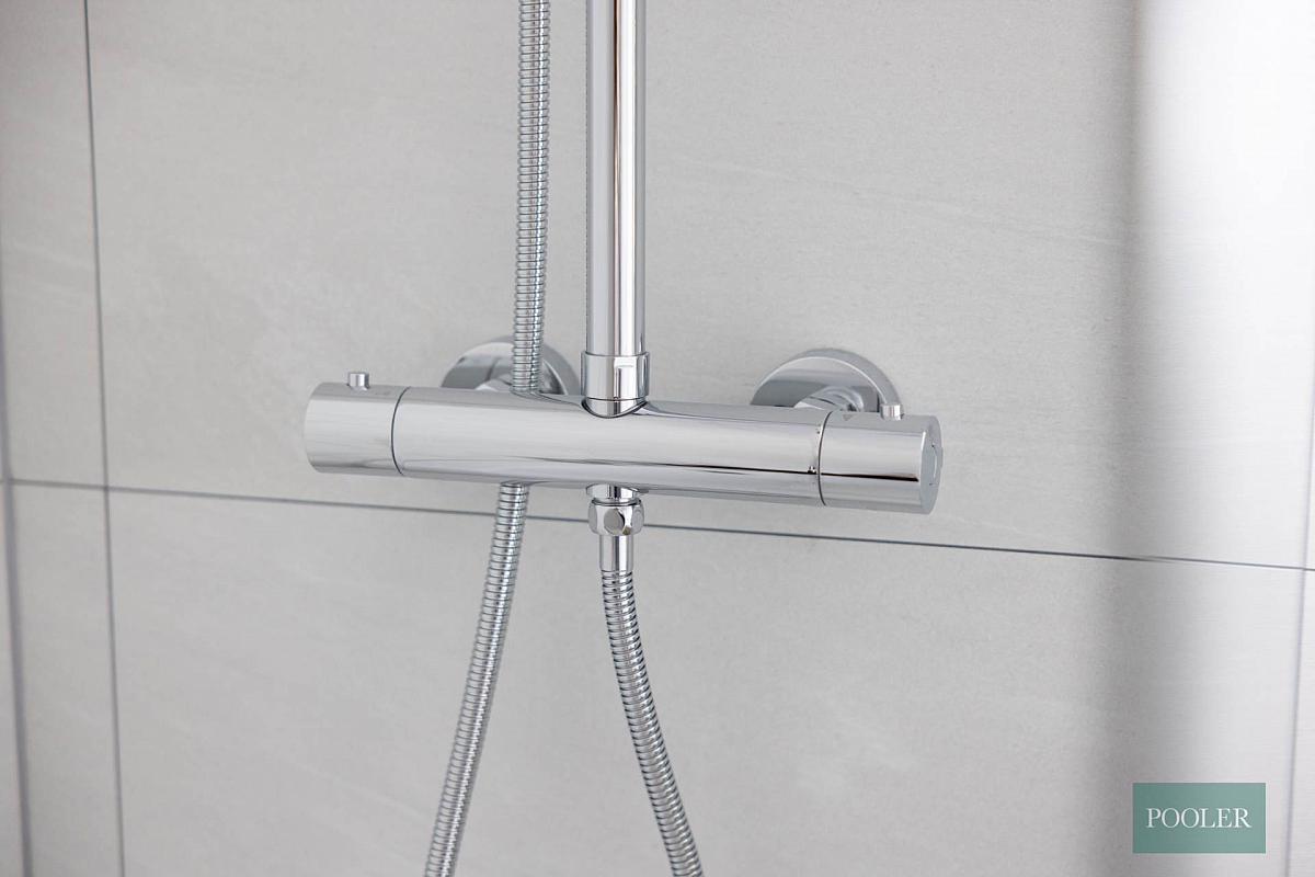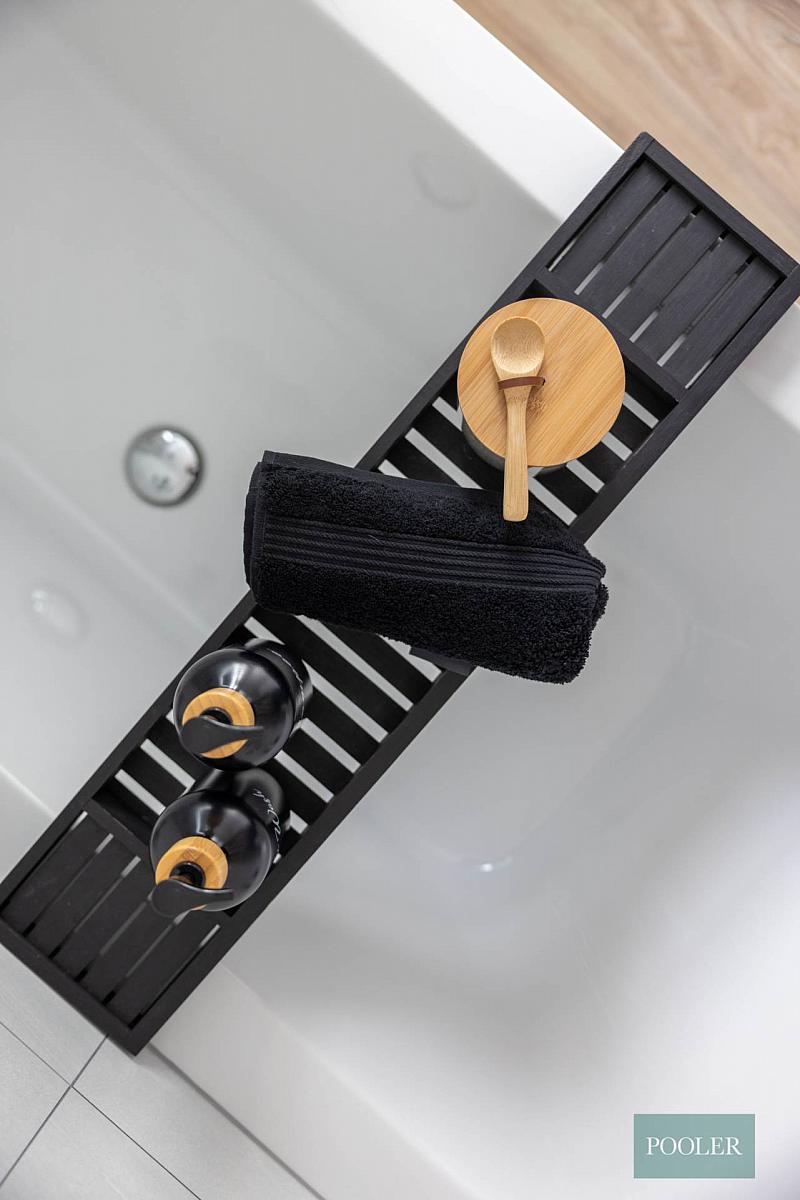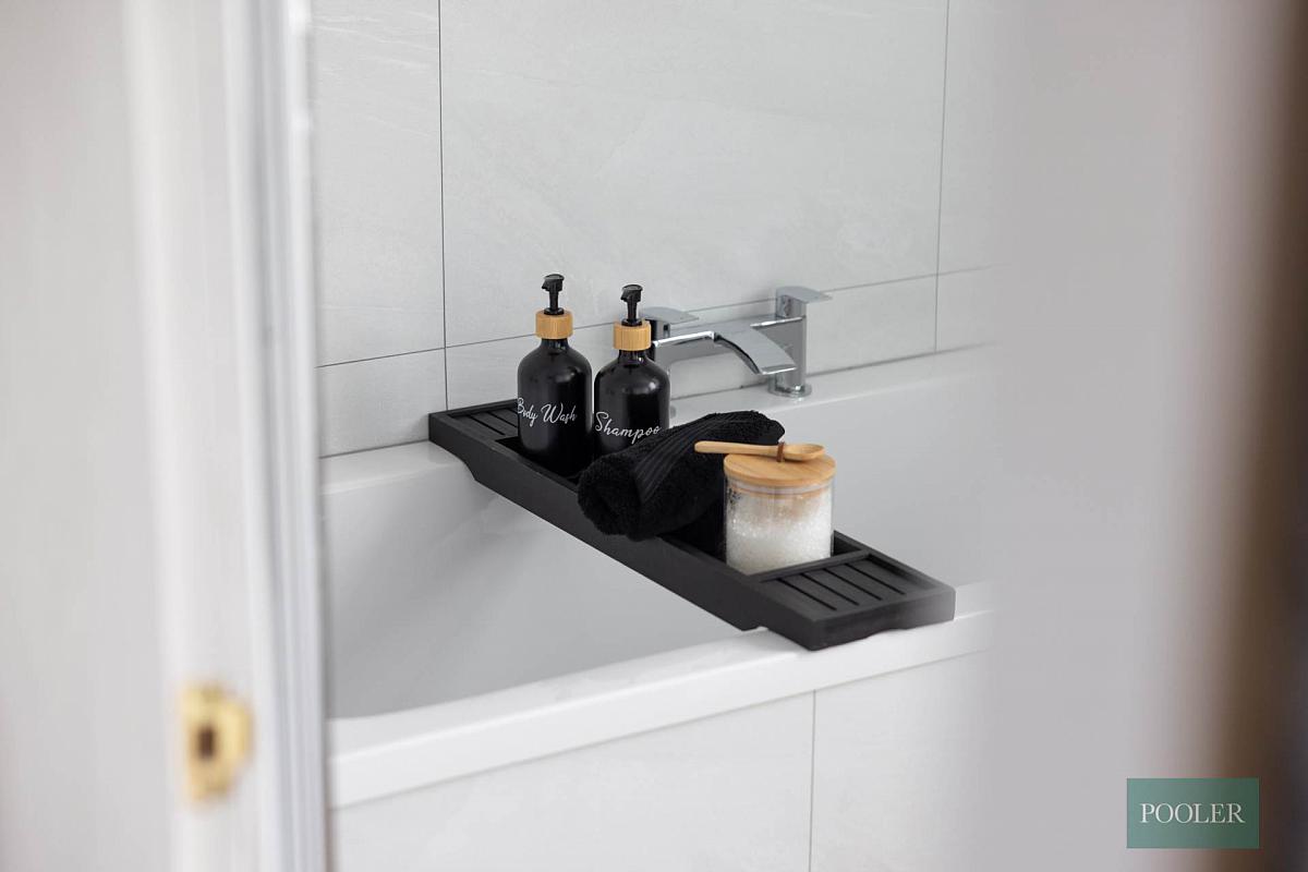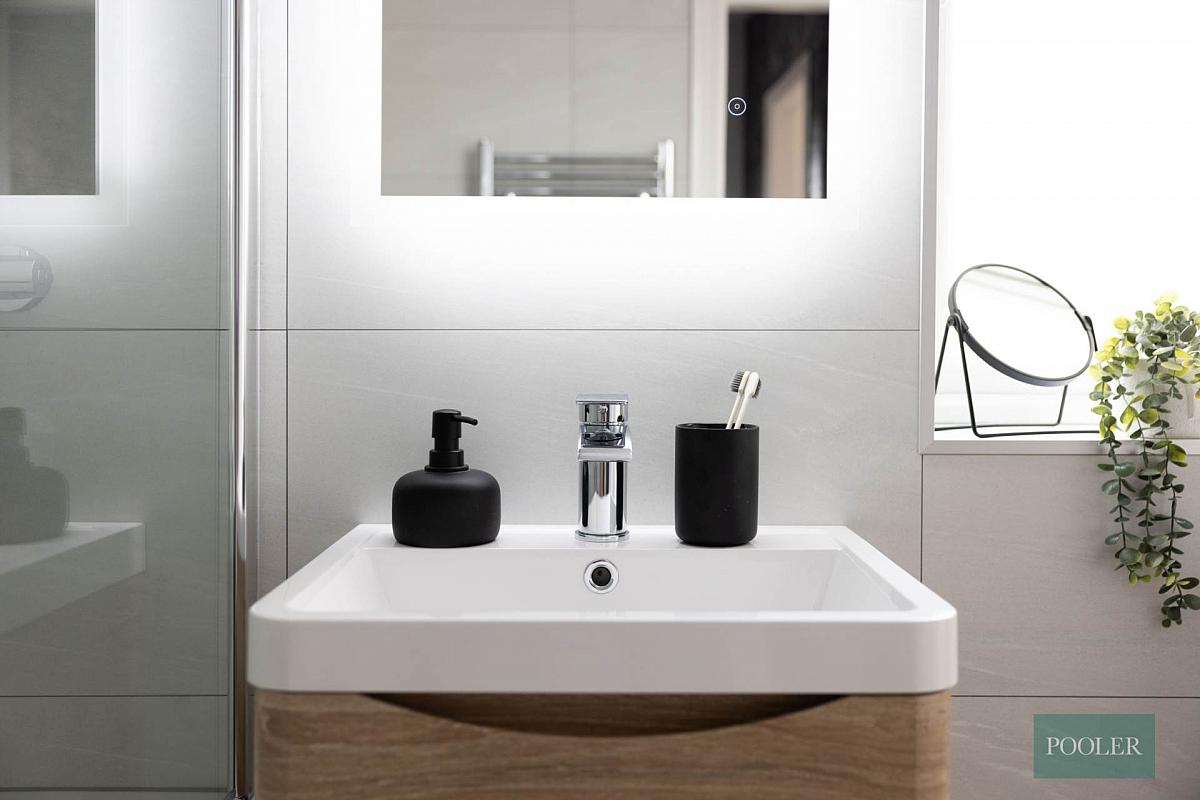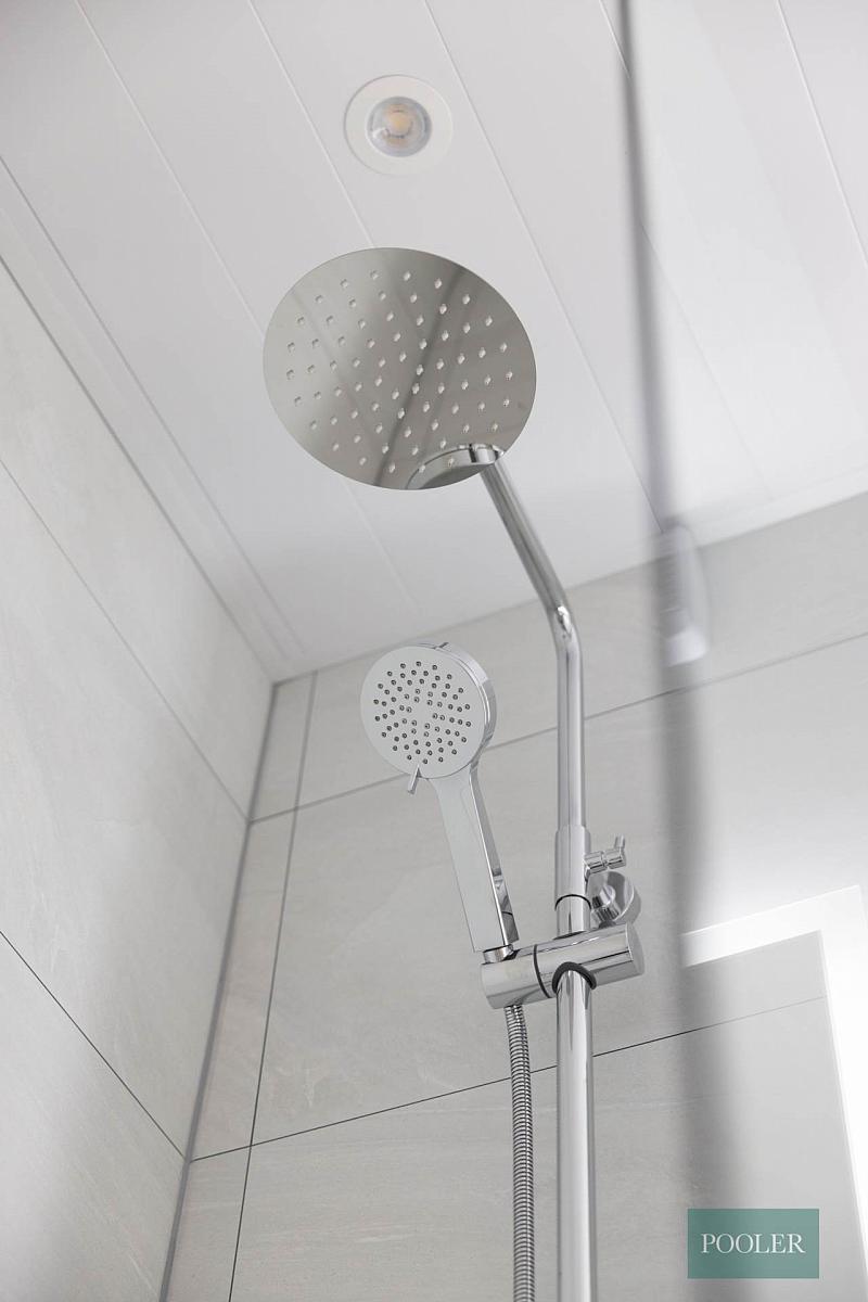 White suite - bath with side mounted taps, thermostatic shower, and shower screen, wash hand basin in two drawer, wall hung, timber effect vanity unit, W.C., modern, tiled effect PVC panelled walls, timber effect LVT flooring, PVC panelled ceiling with recessed spotlights, and extractor fan