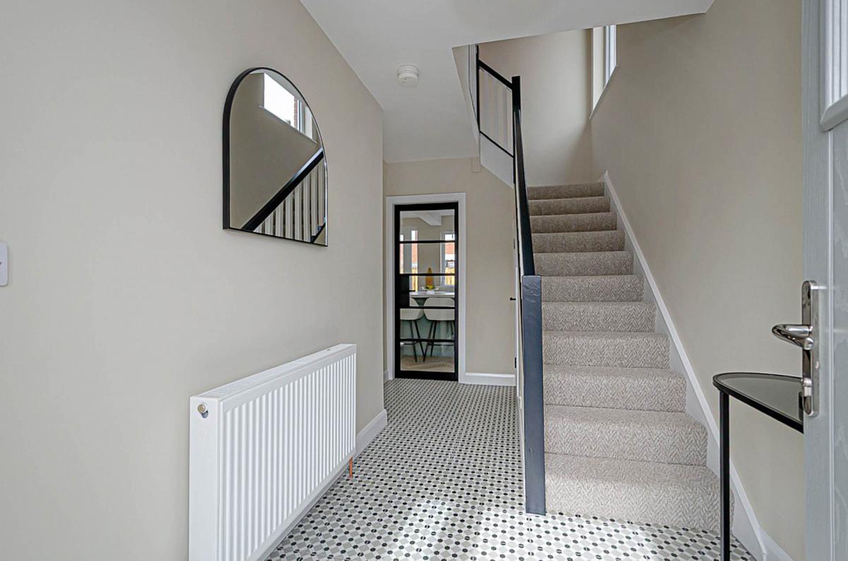 Step inside via the welcoming entrance hall, featuring an elegant decorative tiled floor, and discover a bright and spacious living room with a large bay window and contemporary double doors that create a seamless flow through the home.