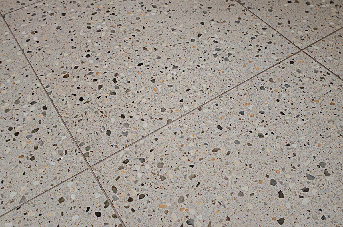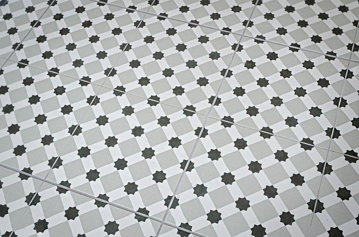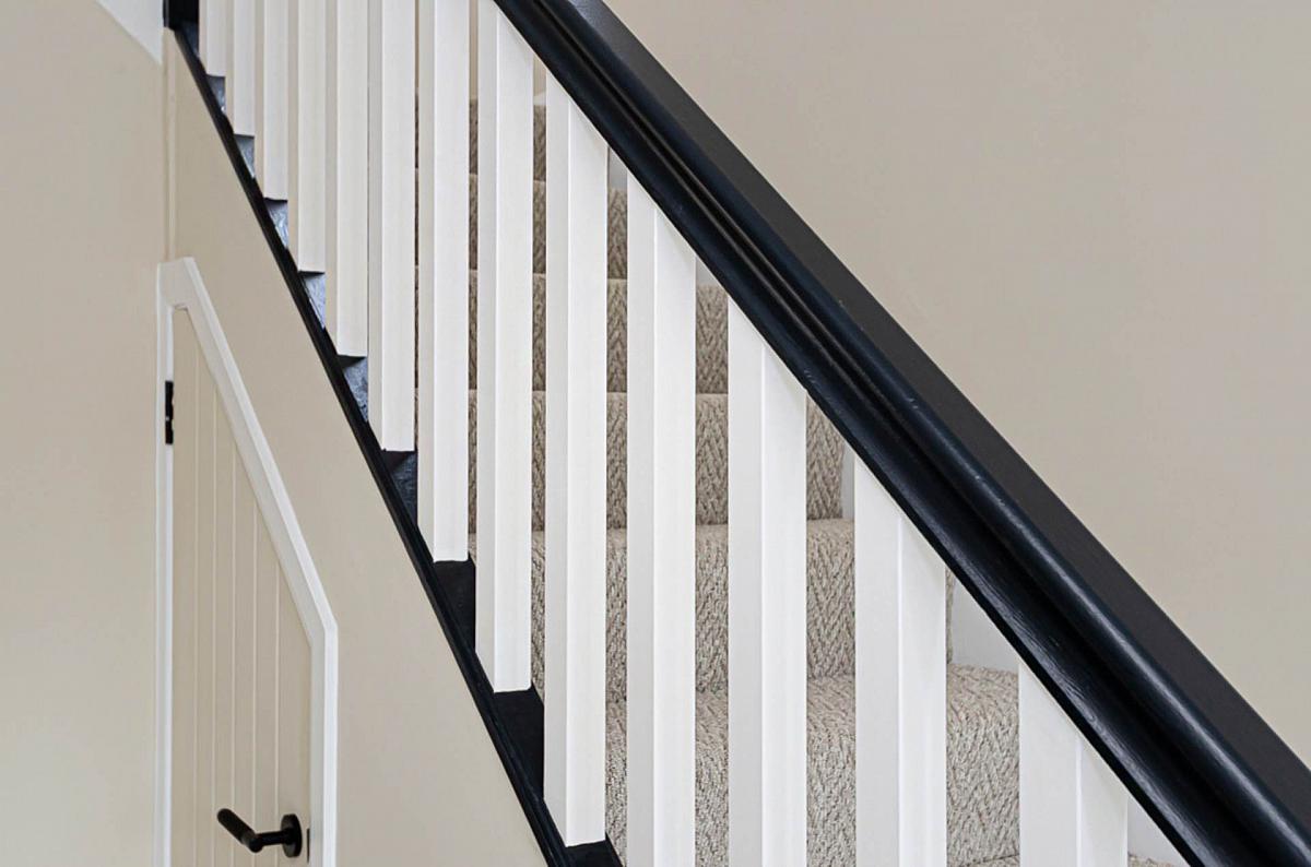 Decorative ceramic tiled floor, anthracite hand rail, and storage under stair