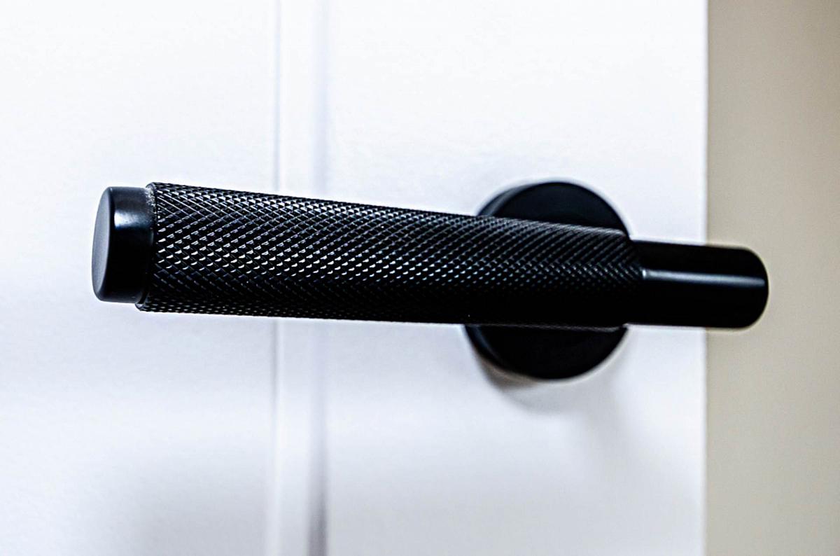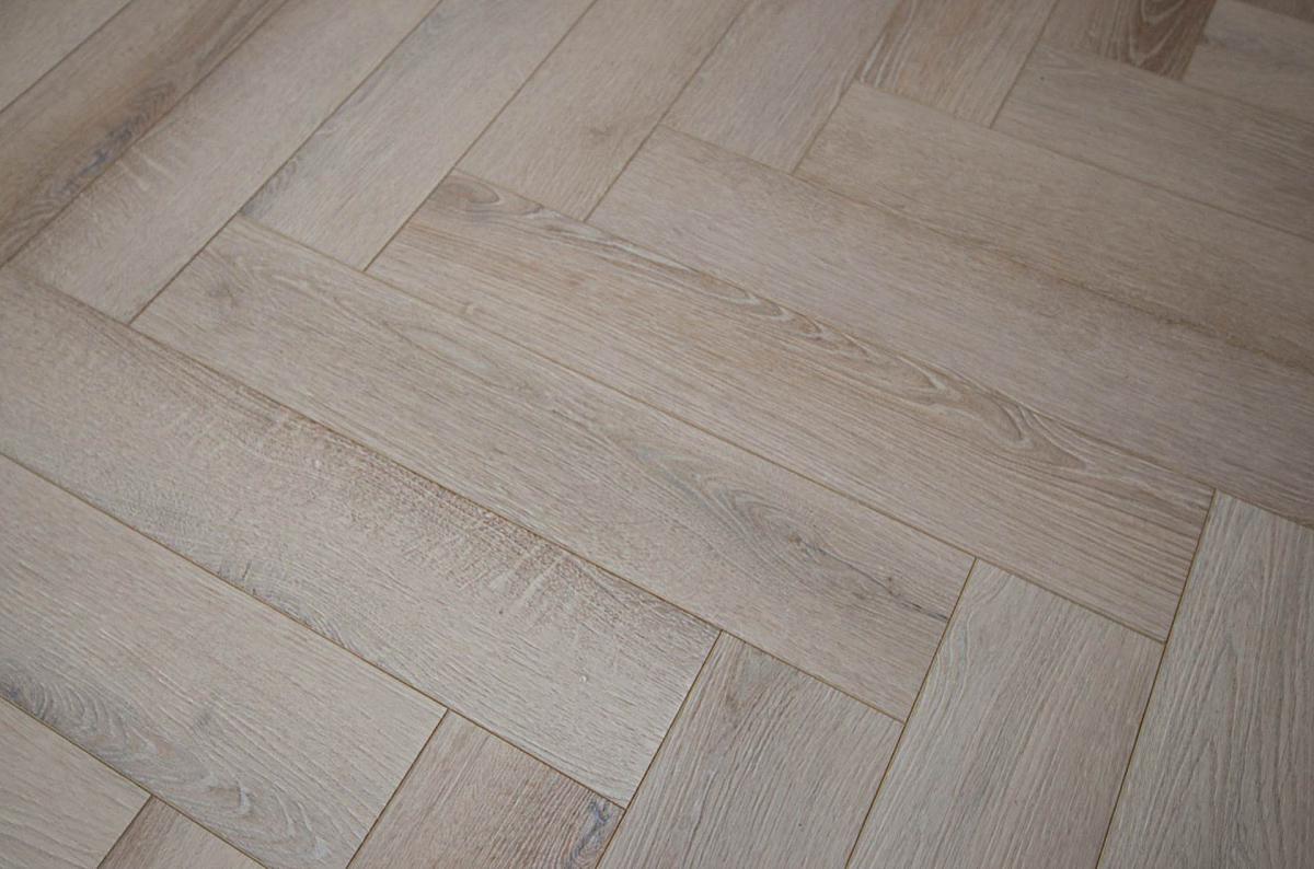Bay window, light oak herringbone timber laminate floor, and double doors in black frames to..