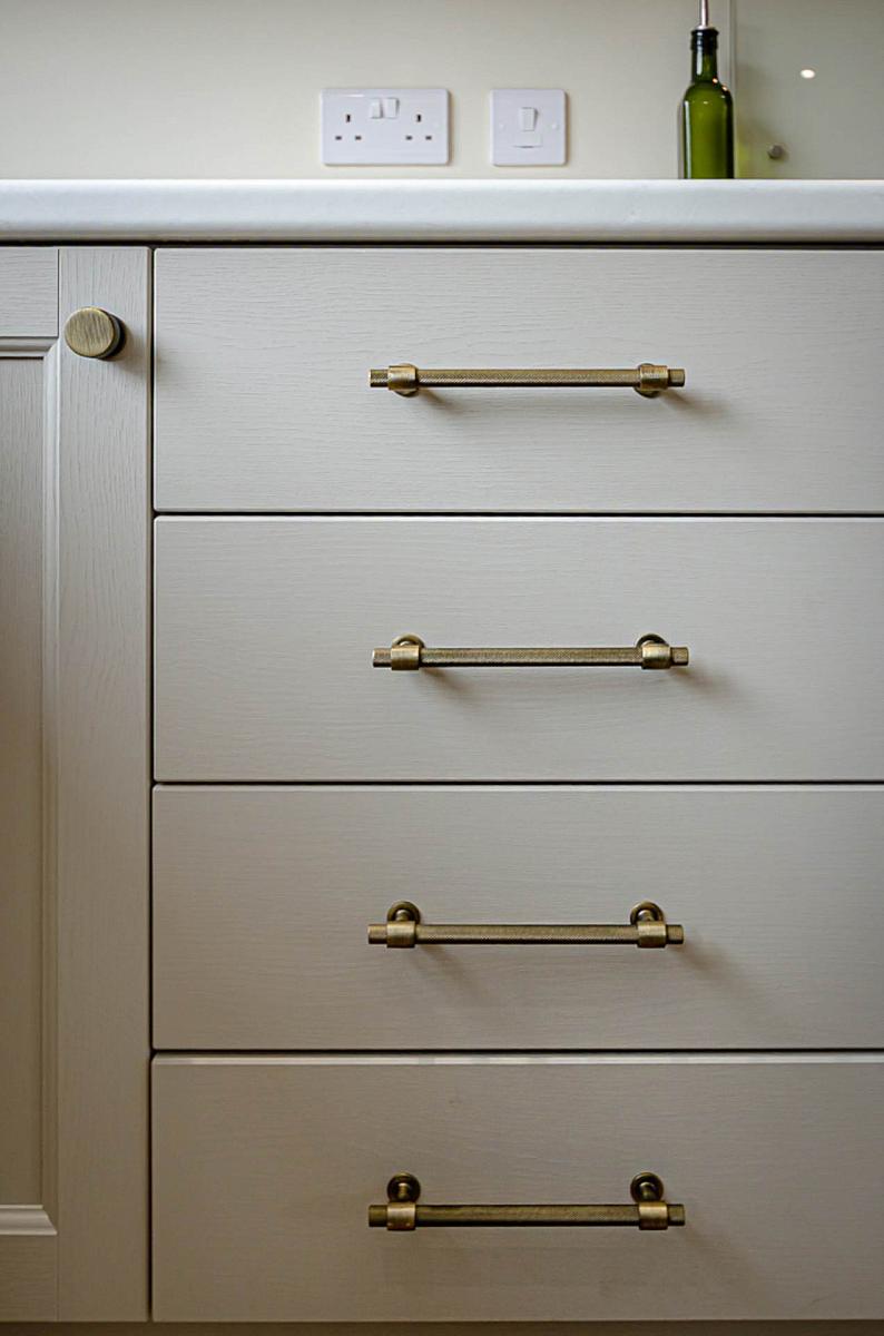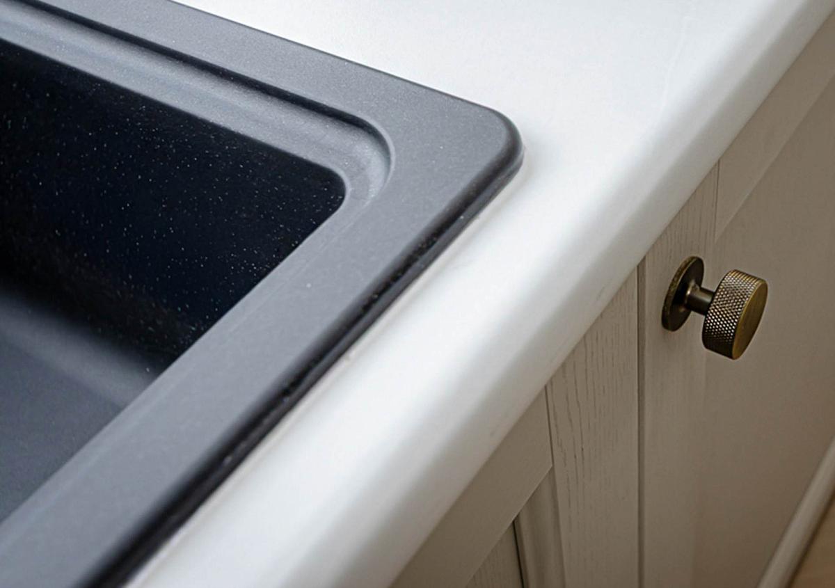 Newly fitted kitchen in two tones, integrated black oven, ceramic hob, black extractor canopy, glass splash back, black sink and mixer tap, peninsula unit with space for under counter fridge and freezer, space for integrated washing machine, recessed spotlights, herringbone timber laminate floor, space for dining and French doors to garden