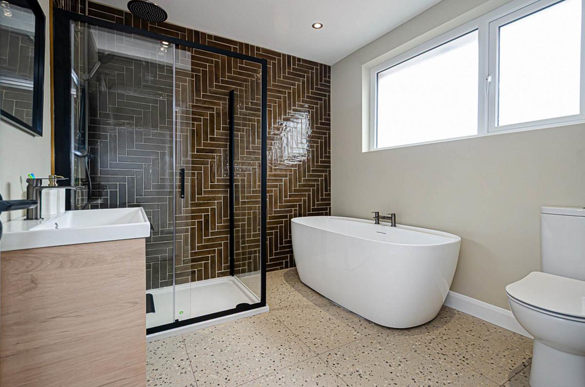 Newly fitted bathroom with freestanding bath and separate shower cubicle