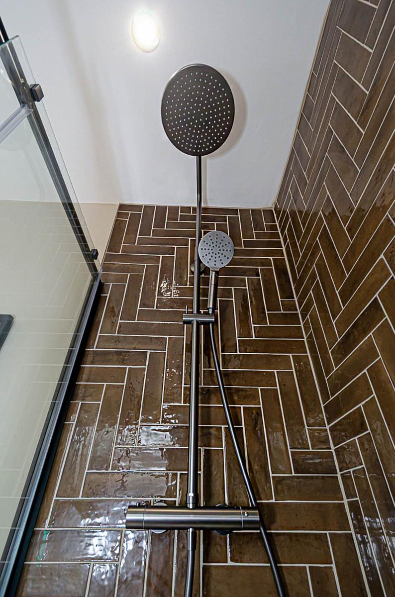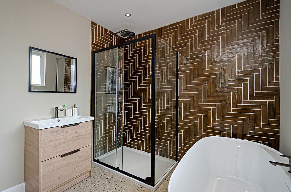 Freestanding bath with brushed gun metal taps, wash hand basin in timber two drawer vanity unit, W.C., large walk in shower cubicle with brushed gun metal thermostatic shower, dual shower heads, and sliding door feature, statement herringbone glazed tiling, terrazzo effect ceramic tiled floor, grey towel rail radiator, recessed spotlights and extractor fan