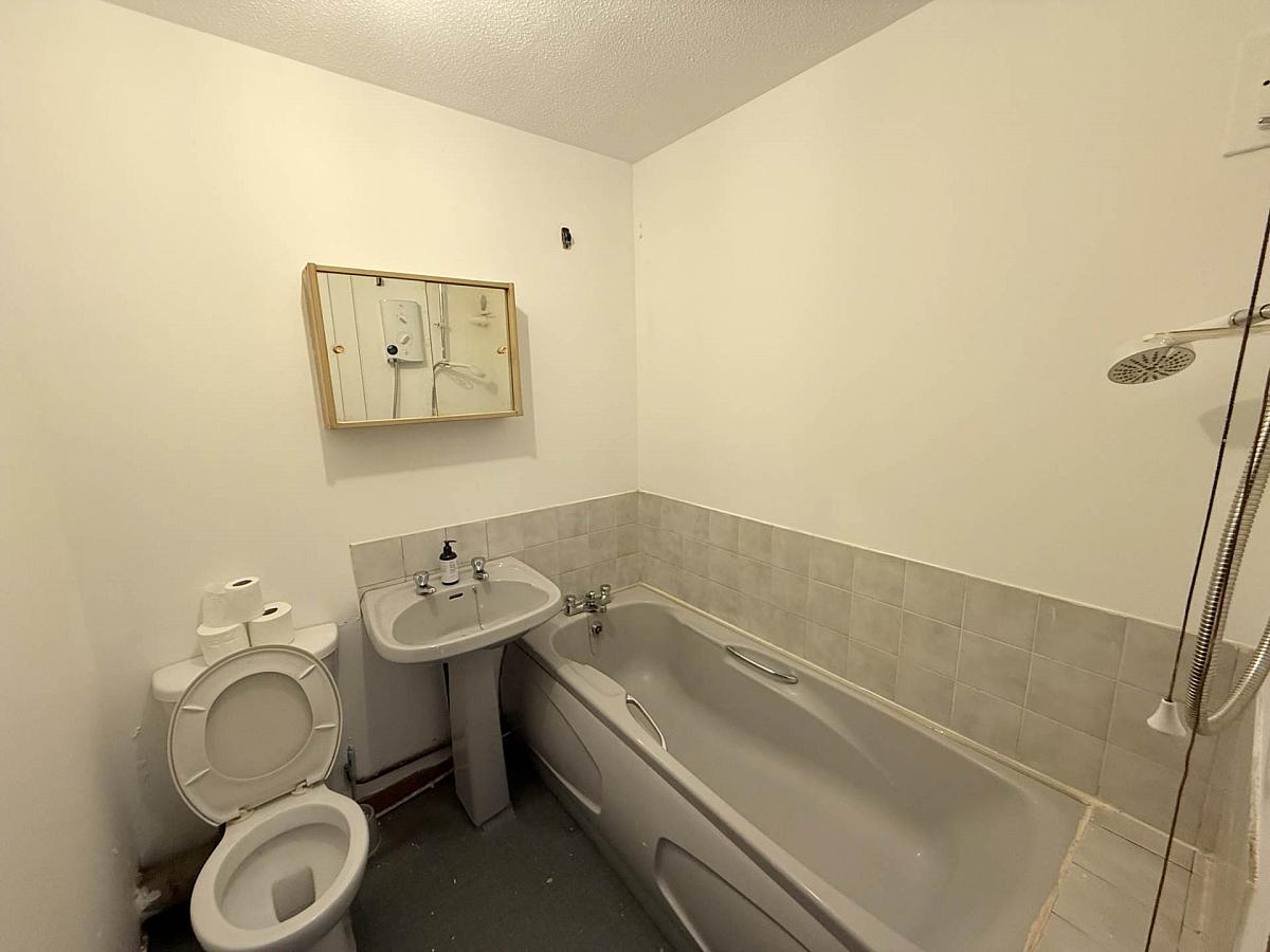 Coloured suite with electric shower over bath and part tiled walls