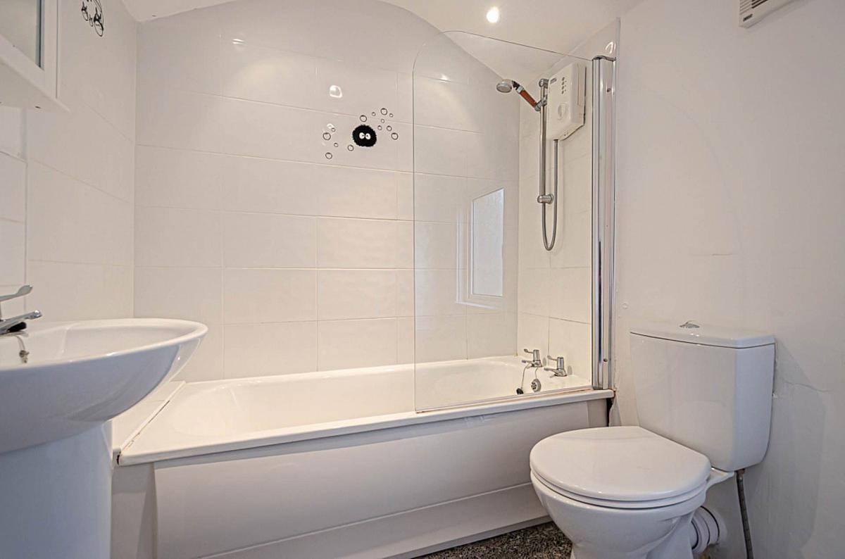 White suite with electric shower and screen over bath, tiled shower area, wash hand basin, W.C., recessed spotlights and extractor fan