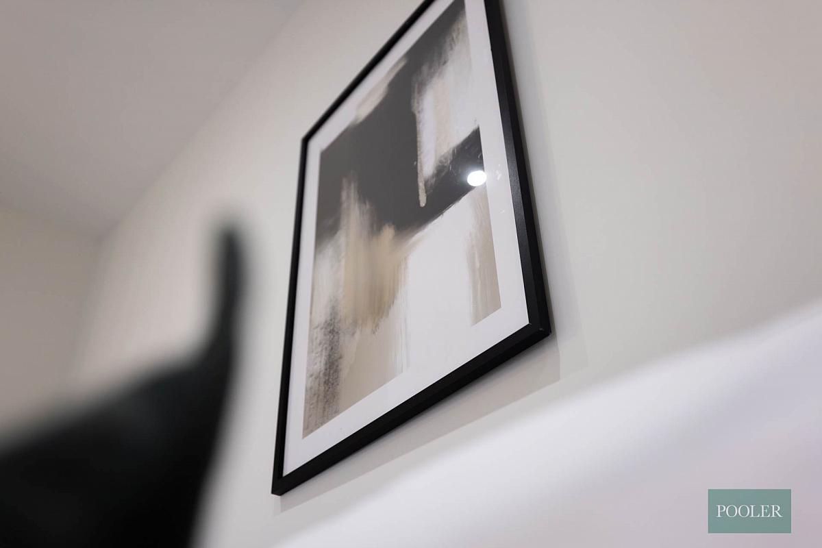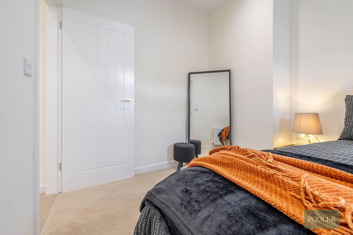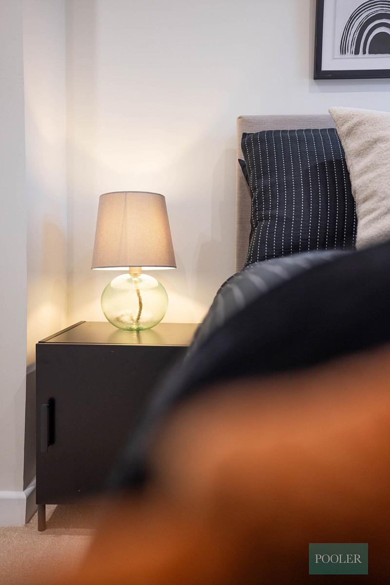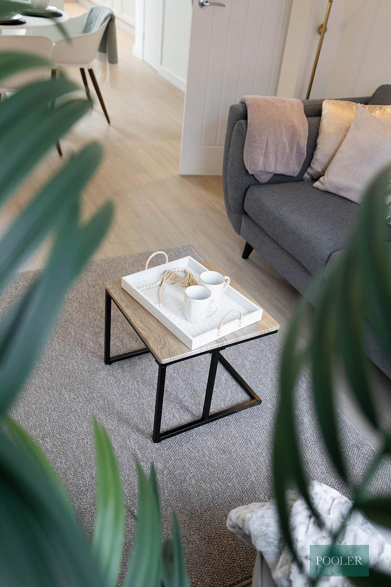 The living room is a relaxing retreat, complete with a feature electric fire that adds warmth and ambience, while modern lighting enhances the bright and uplifting atmosphere.