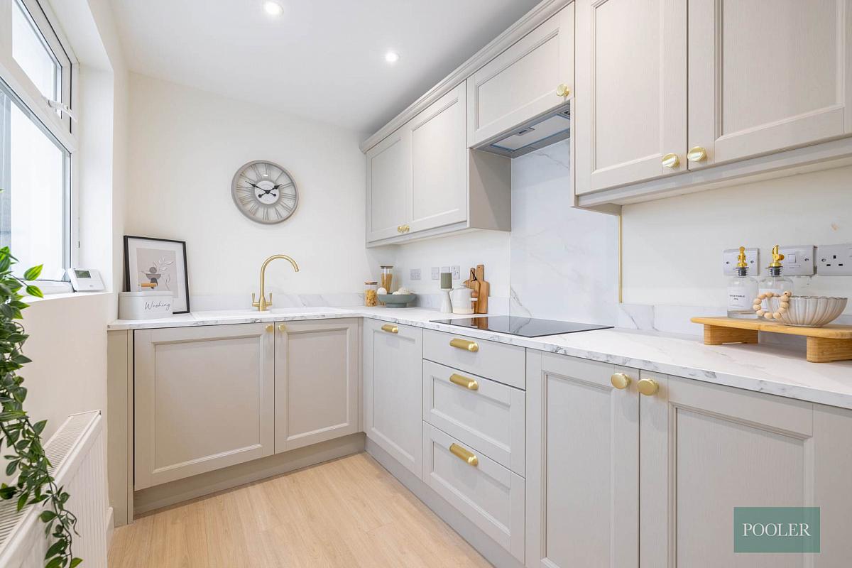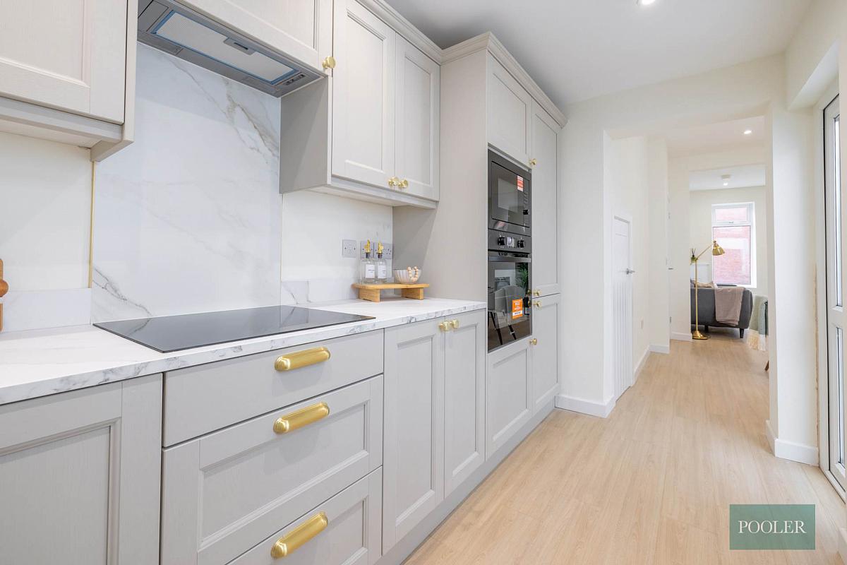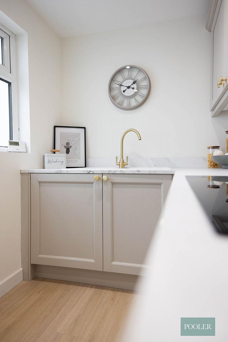 Newly fitted range of high and low level units in light grey finish with brass handles, integrated oven and microwave, ceramic hob, splashback, concealed extractor fan, integrated fridge freezer, integrated dishwasher, integrated washing machine, white sink with brass mixer tap, timber laminate floor, and recessed spotlights