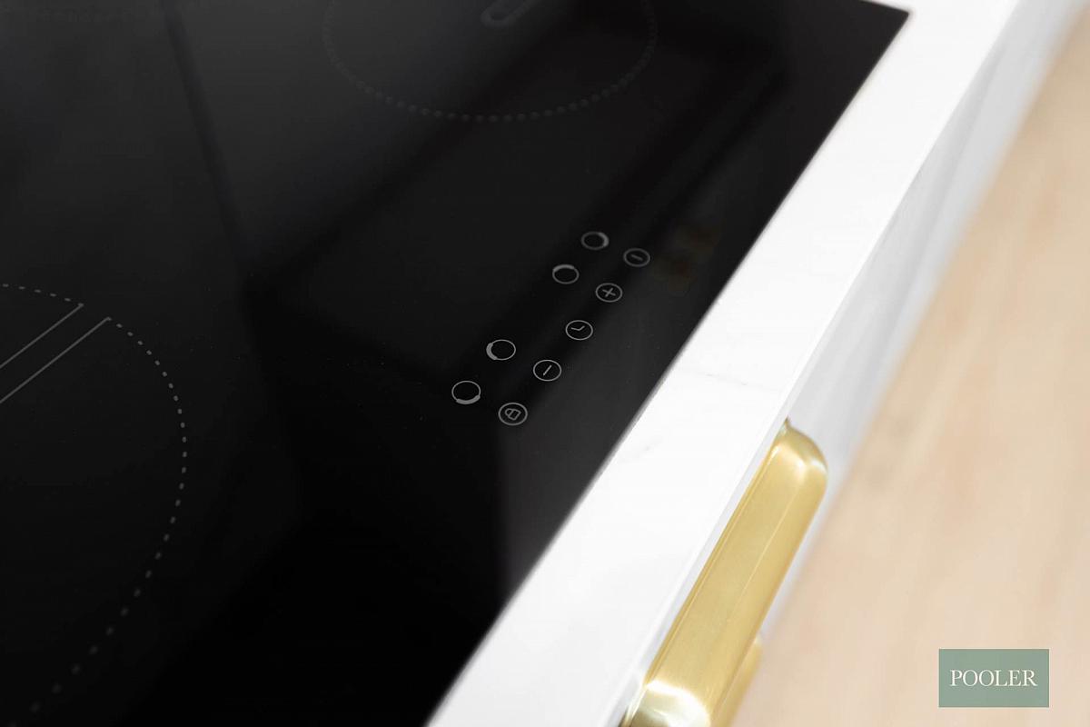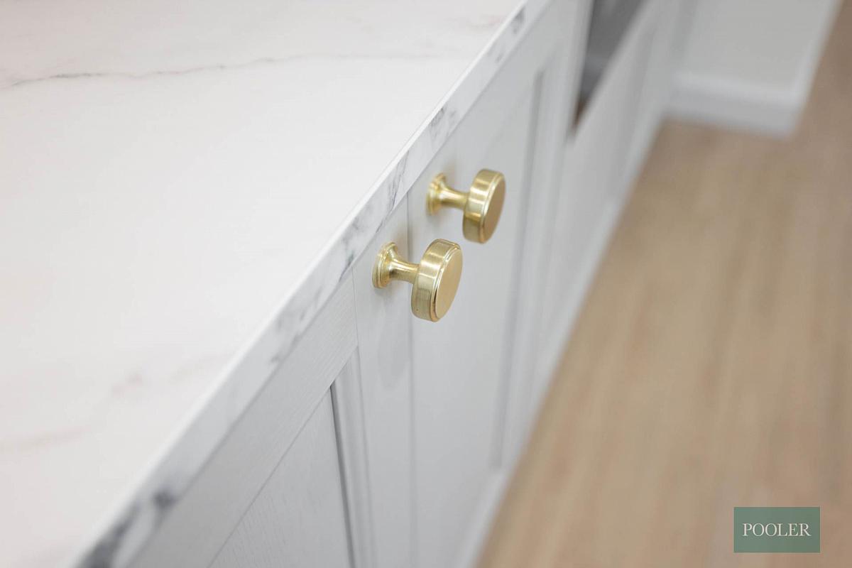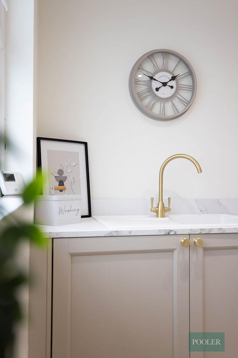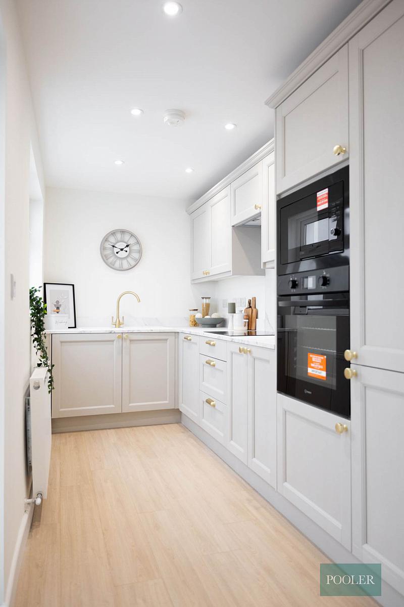 Newly fitted range of high and low level units in light grey finish with brass handles, integrated oven and microwave, ceramic hob, splashback, concealed extractor fan, integrated fridge freezer, integrated dishwasher, integrated washing machine, white sink with brass mixer tap, timber laminate floor, and recessed spotlights
