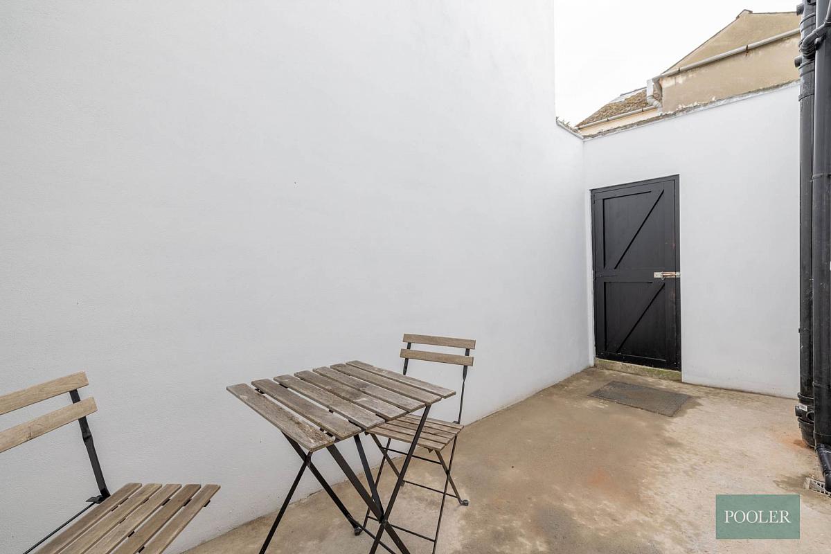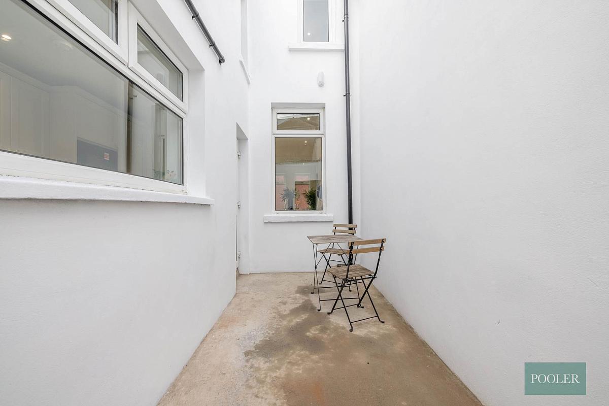 To the rear, a private courtyard provides a versatile outdoor space, perfect for dining al fresco, entertaining friends, or simply enjoying a quiet moment with a good book.