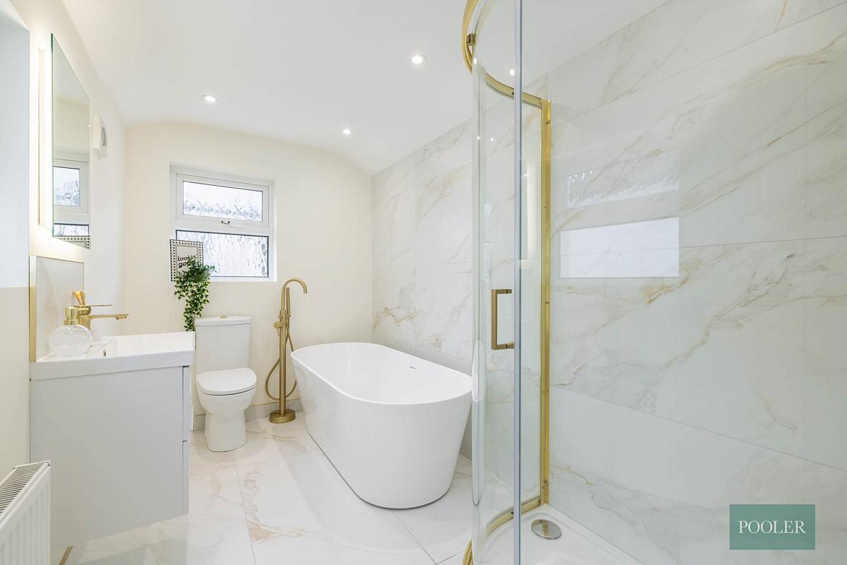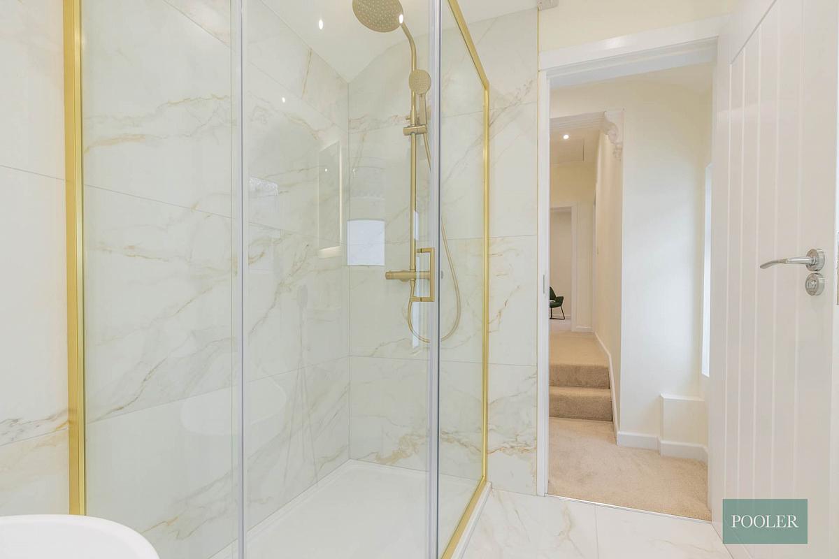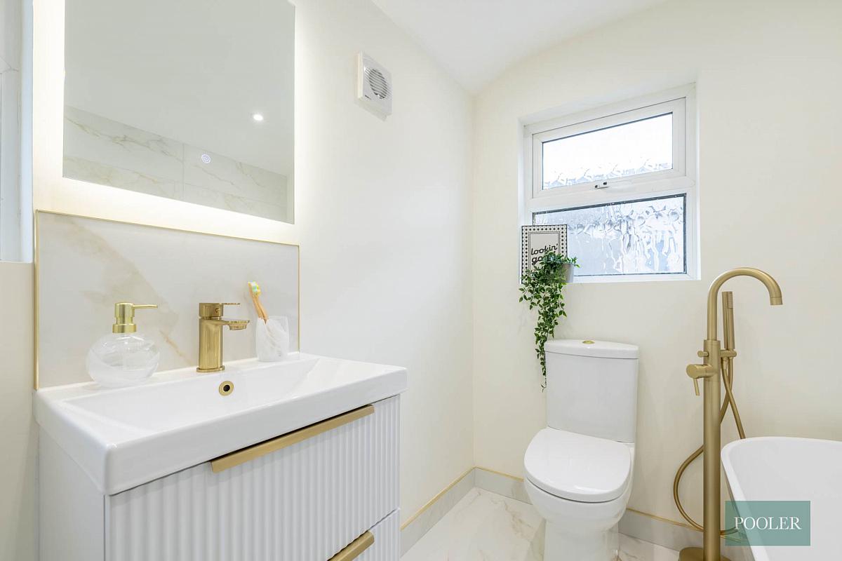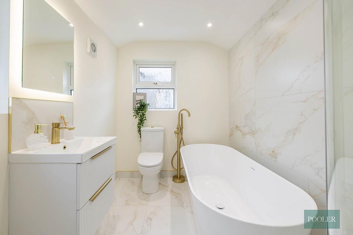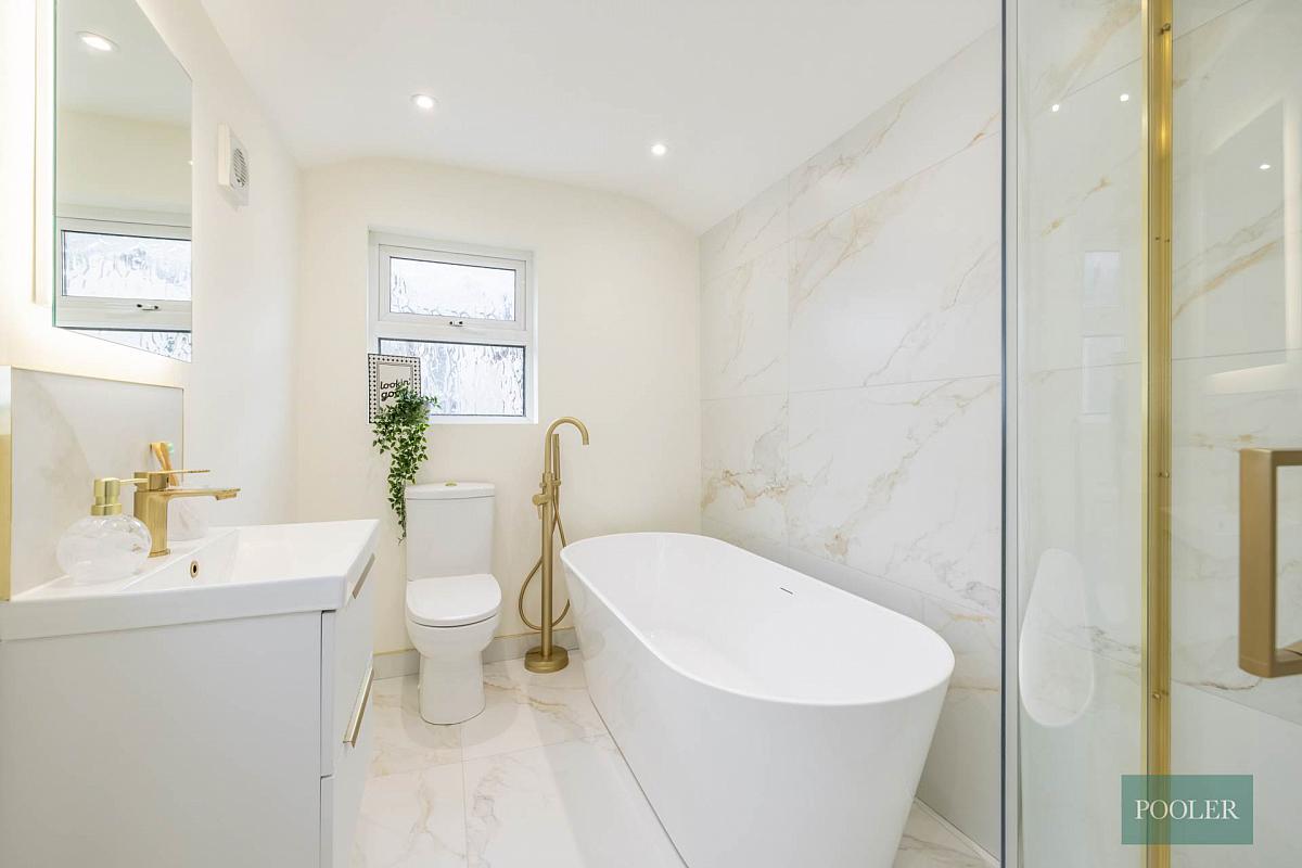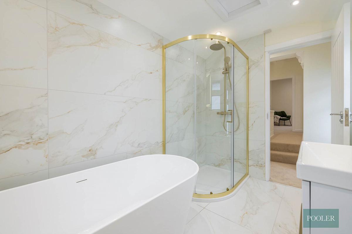 Upstairs, the stunning bathroom is a true highlight, featuring a freestanding bath, a separate shower cubicle, and striking brushed brass fittings that bring a touch of luxury and sophistication. It's a spa-like haven to enjoy at the end of the day.