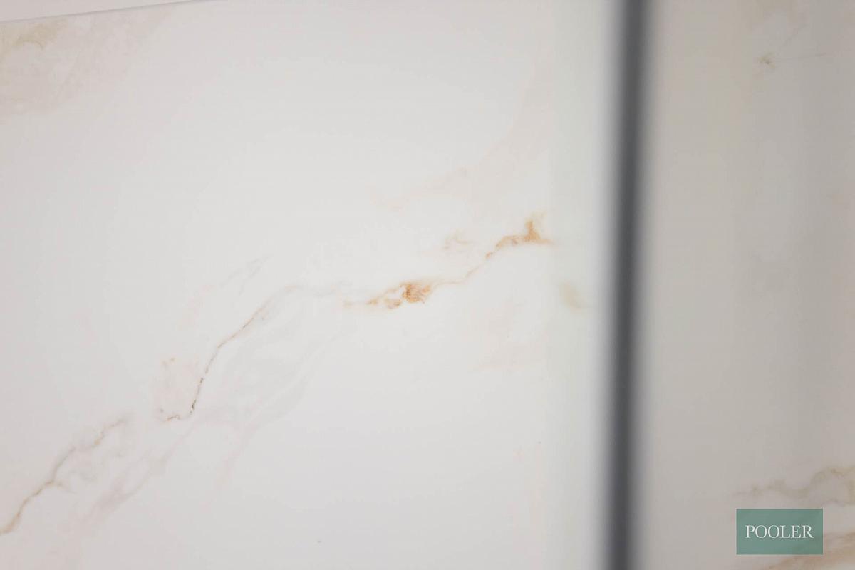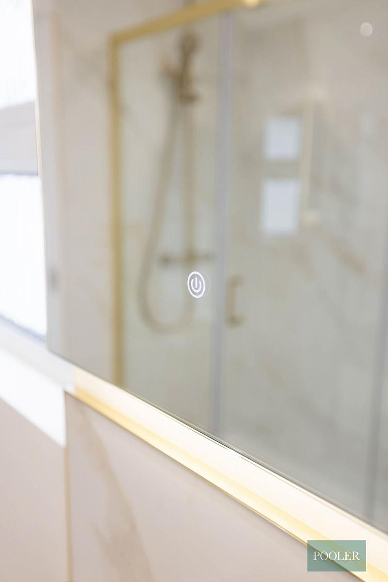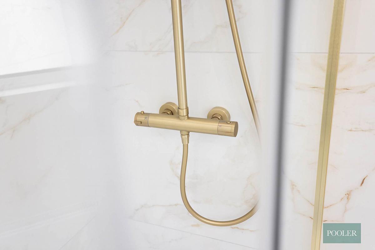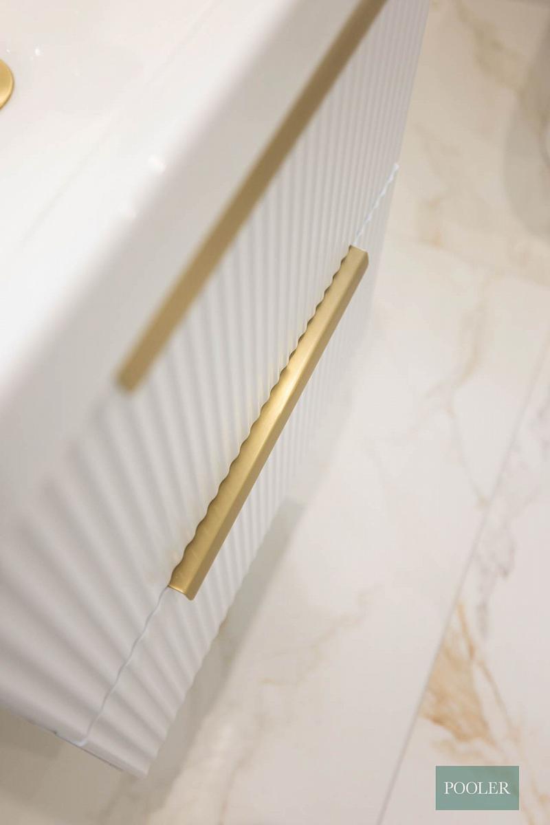 White suite - freestanding bath with brushed brass mixer tap, wash hand basin in two drawer, wall hung vanity unit with brushed brass taps and splashback, W.C., separate shower cubicle with brushed brass thermostatic shower, dual shower heads, and sliding doors, marble effect wall tiling, marble effect floor tiling and upstand, and extractor fan