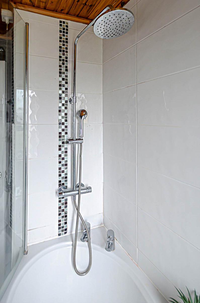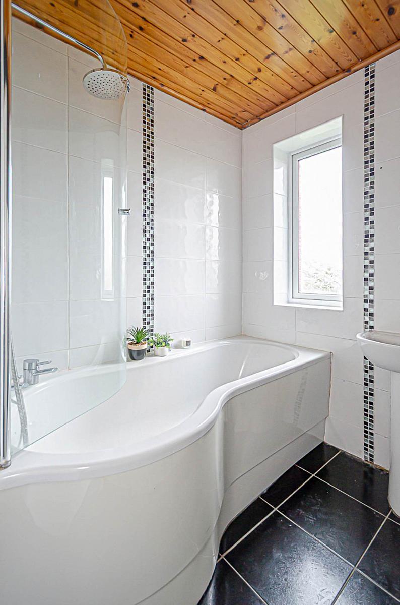 White suite. Curved bath with thermostatic shower and screen, wash hand basin, modern tiled walls, ceramic tiled floor and timber panelled ceiling