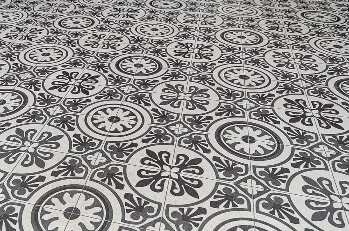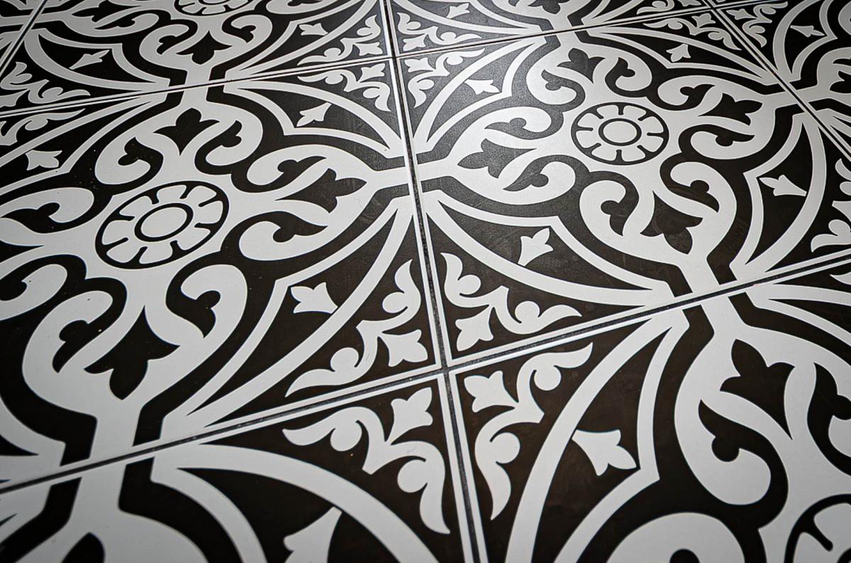 Modern range of high and low level fitted units, black integrated oven, gas hob, stainless steel extractor canopy, part tiled walls, black and white tiled floor, spotlights, and plumbing for dishwasher