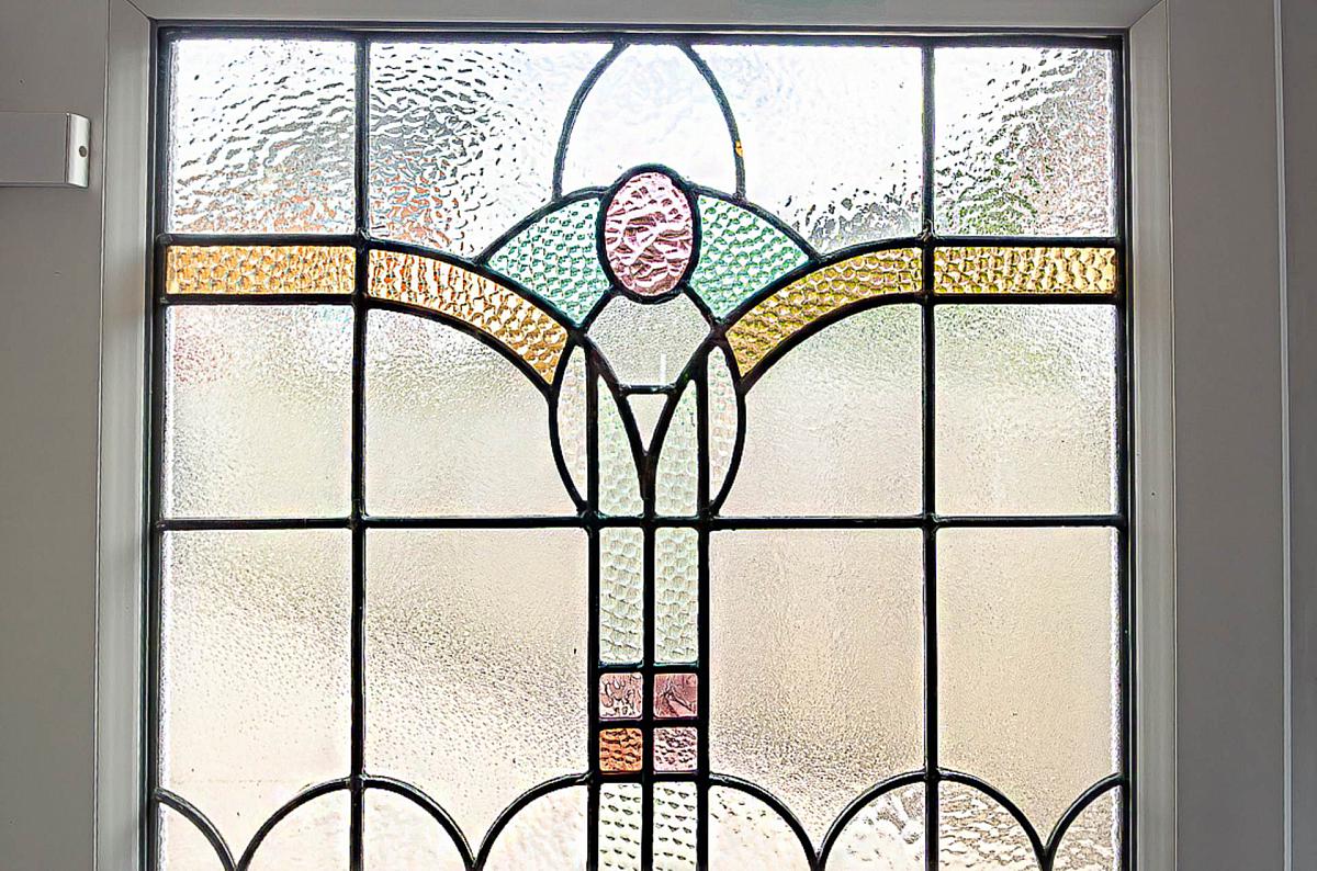 Cornice, picture rail, original timber feature at bay, stained glass windows, feature fireplace with tiled hearth, and anthracite vertical radiator