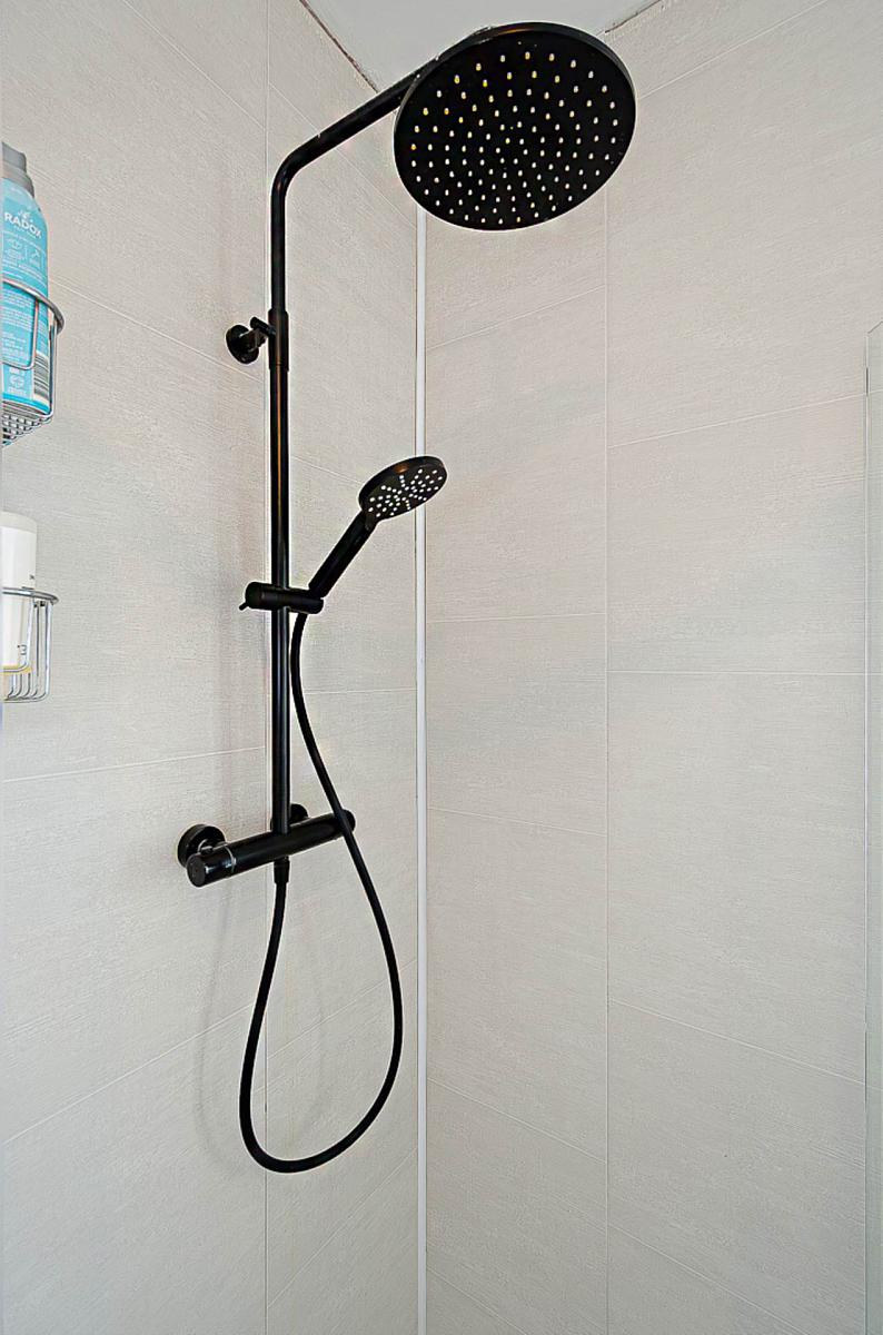White suite - bath with black side mounted mixer taps, wash hand basin with black mixer tap, W.C. separate shower cubicle with black thermostatic shower, part tiled walls, decorative ceramic tiled walls, and extractor fan