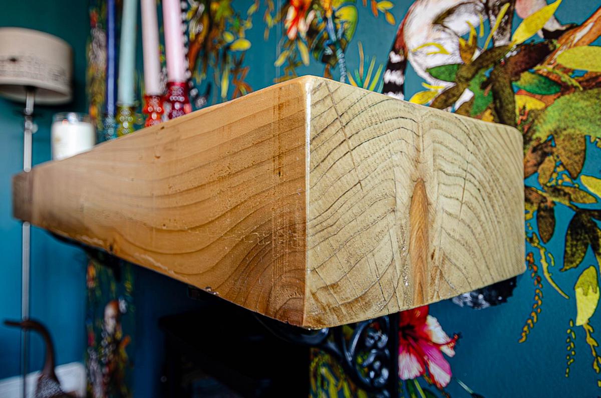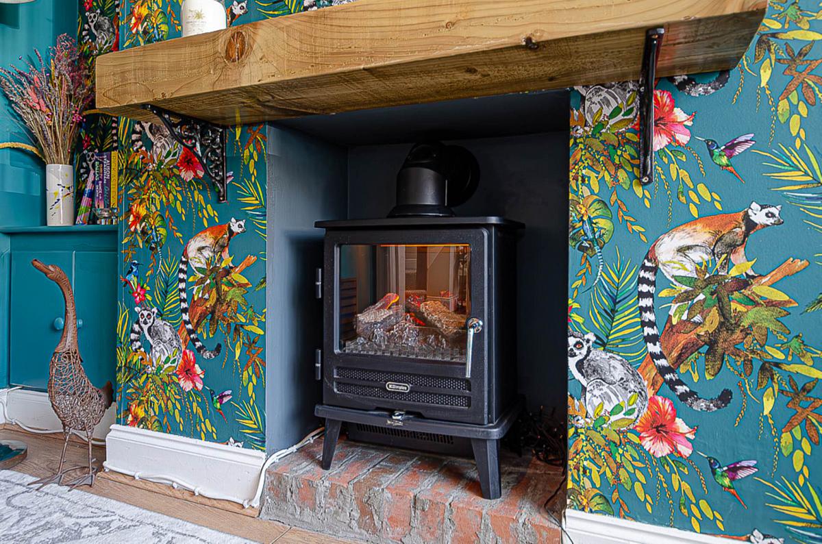 Bay window, hole in the wall fireplace with brick hearth, cornice, and timber laminate floor