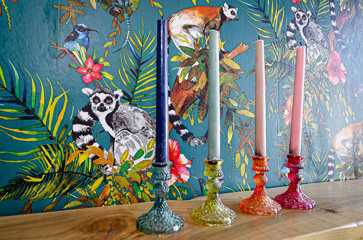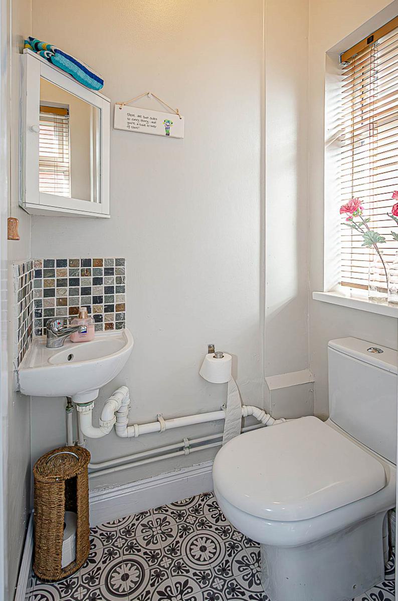 Wall mounted wash hand basin with tiled splashback and W.C.