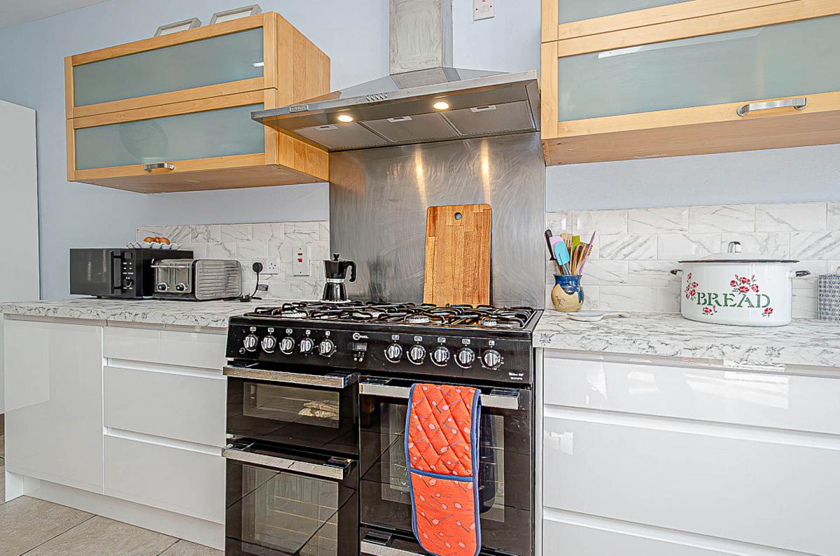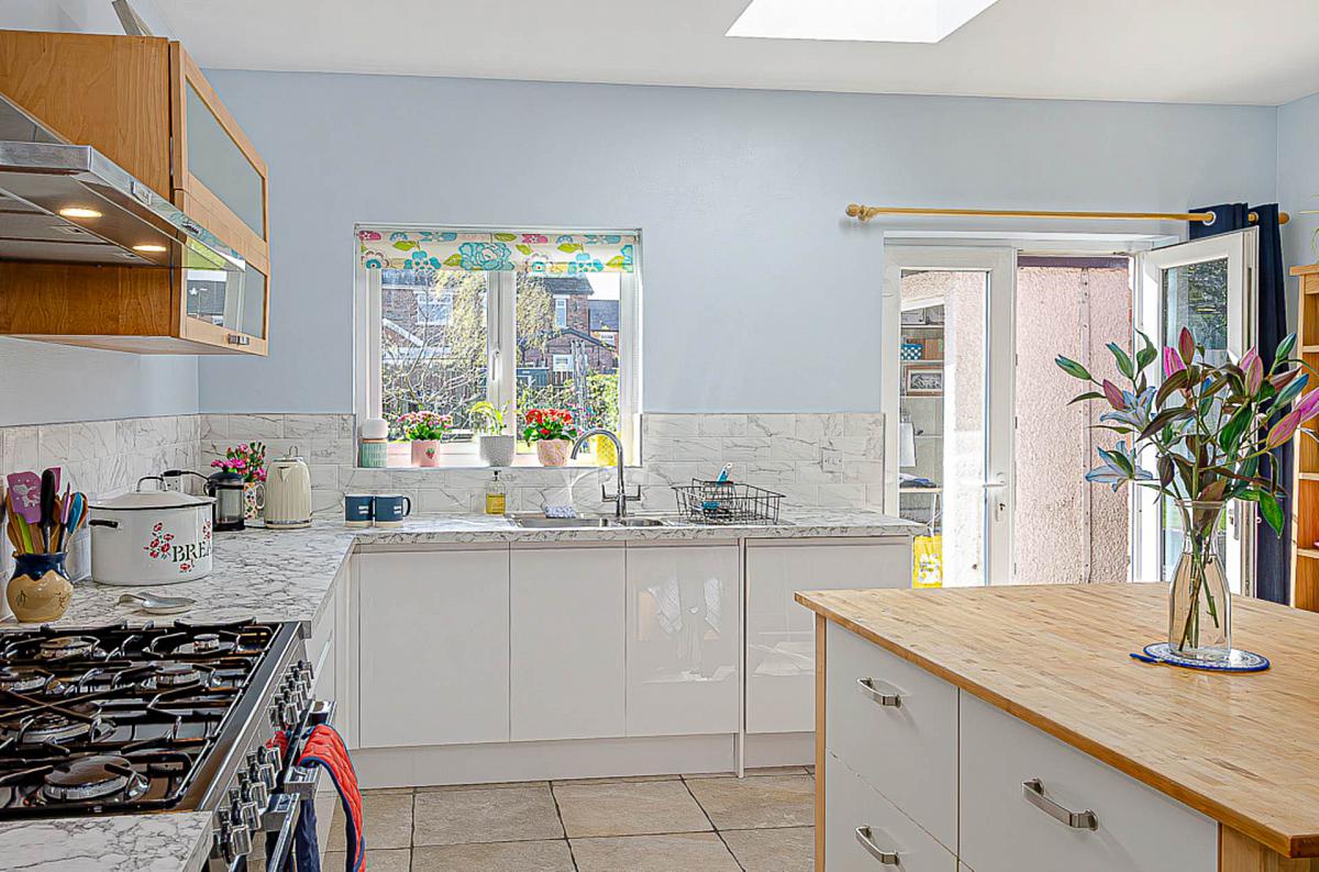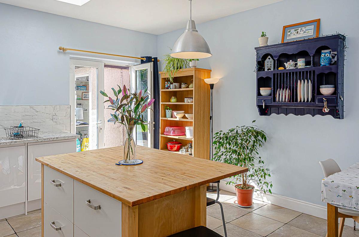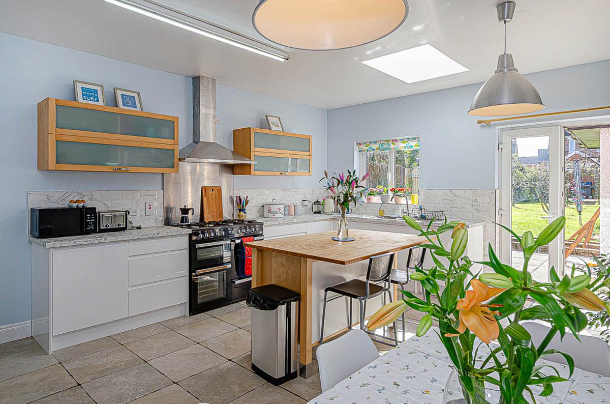 Range of high and low level fitted units, Flavel range cooker, stainless steel splash back and wide extractor canopy, stainless steel bowl and a half sink, island unit with storage and woodblock countertop, integrated dishwasher, part tiled walls, ceramic tiled floor, velux window, and French doors to garden