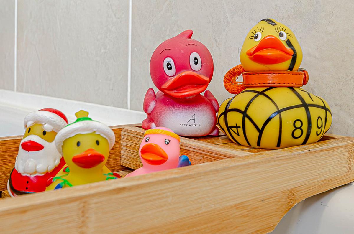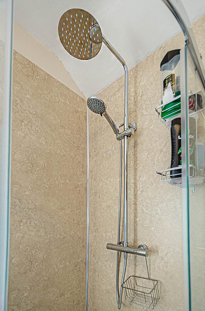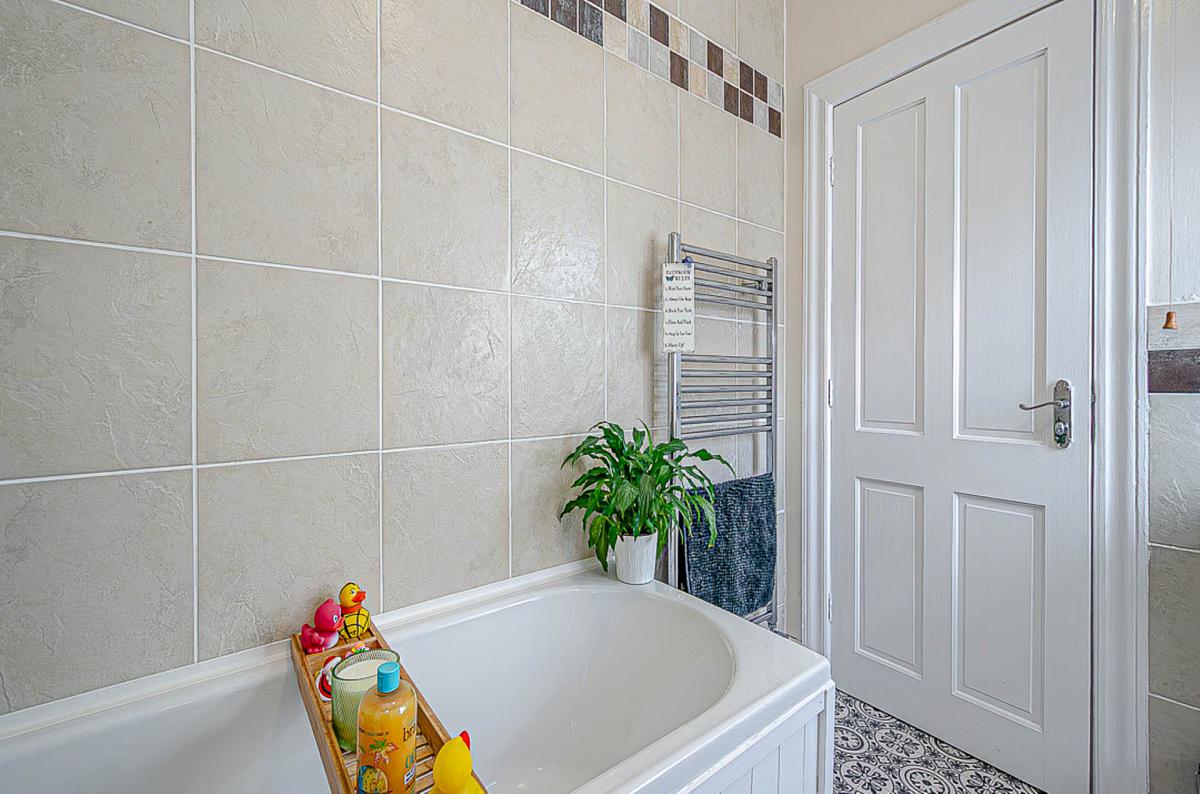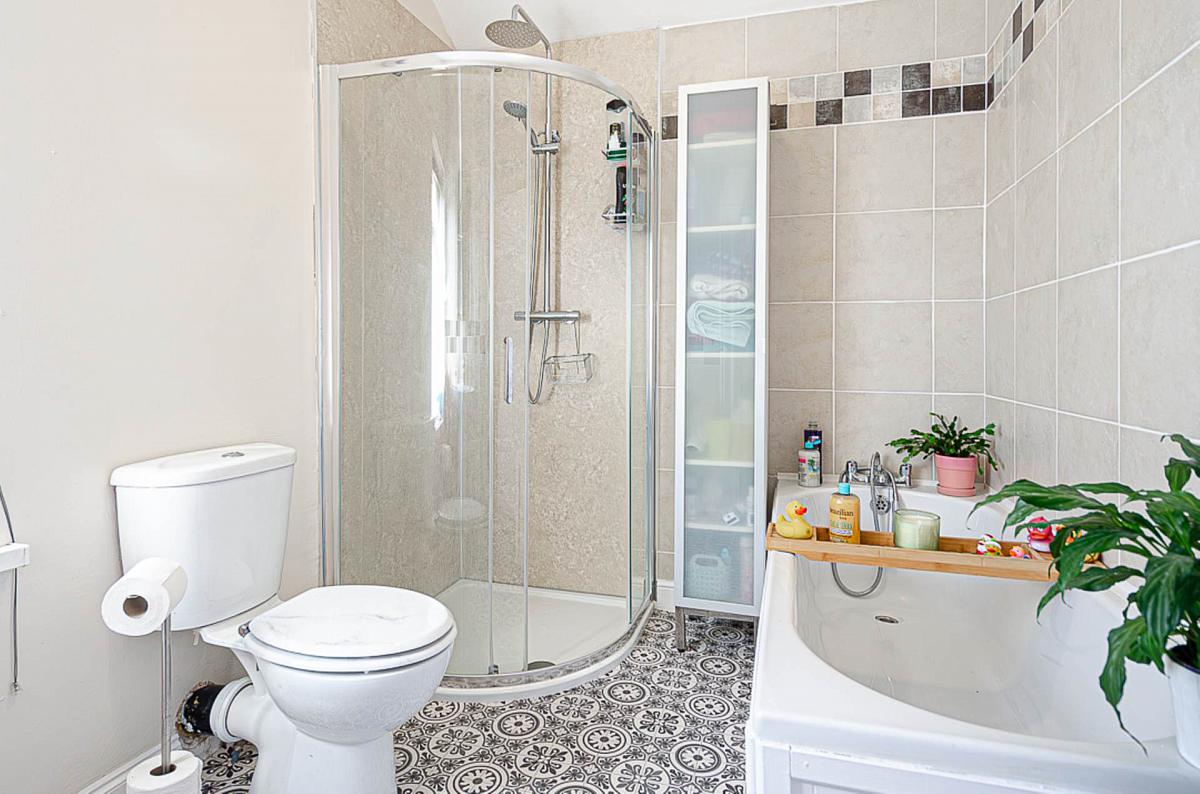 White suite. Bath with shower attachment and screen, wash hand basin, W.C., separate shower cubicle with thermostatic shower, dual shower heads, and sliding door, modern tiled walls, chrome tower rail radiator, and extractor fan